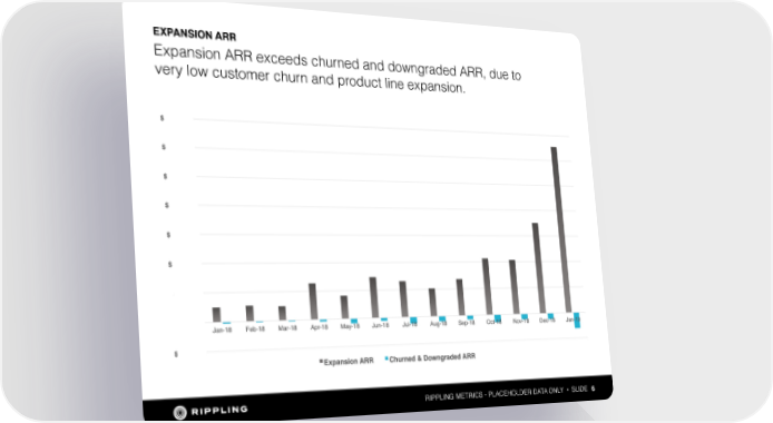 Rippling Investor Memo: $45M Series A Page 5 Page 7EXPANSION ARR Expansion ARR exceeds churned and downgraded ARR, due to very low customer churn and product line expansion. RIPPLING METRICS - PLACEHOLDER DATA ONLY • SLIDE 6