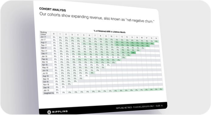 COHORT ANALYSIS Our cohorts show expanding revenue, also known as “net-negative churn.” % of Retained ARR in Lifetime Month Booking 0 1 2 3 4 5 6 7 8 9 10 11 12 13 14 15 16 17 18 19 Cohort Jun-17 X% X% X% X% X% X% X% X% X% X% X% X% X% X% X% X% X% X% X% X% Jul-17 X% X% X% X% X% X% X% X% X% X% X% X% X% X% X% X% X% X% X% Aug-17 X% X% X% X% X% X% X% X% X% X% X% X% X% X% X% X% X% X% Sep-17 X% X% X% X% X% X% X% X% X% X% X% X% X% X% X% X% X% Oct-17 X% X% X% X% X% X% X% X% X% X% X% X% X% X% X% X% Nov-17 X% X% X% X% X% X% X% X% X% X% X% X% X% X% X% Dec-17 X% X% X% X% X% X% X% X% X% X% X% X% X% X% Jan-18 X% X% X% X% X% X% X% X% X% X% X% X% X% Feb-18 X% X% X% X% X% X% X% X% X% X% X% X% Mar-18 X% X% X% X% X% X% X% X% X% X% X% X% CONFIRM THIS IS THE RIGHT CHART Apr-18 X% X% X% X% X% X% X% X% X% May-18 X% X% X% X% X% X% X% X% X% Jun-18 X% X% X% X% X% X% X% X% Jul-18 X% X% X% X% X% X% X% Aug-18 X% X% X% X% X% X% Sep-18 X% X% X% X% X% Oct-18 X% X% X% X% Nov-18 X% X% X% Dec-18 X% X% Jan-19 X% Weighted Avg X% X% X% X% X% X% X% X% X% X% X% X% X% X% X% X% X% X% X% X% RIPPLING METRICS - PLACEHOLDER DATA ONLY • SLIDE 5