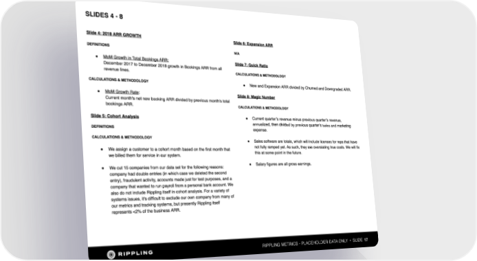 SLIDES 4 - 8 RIPPLING METRICS - PLACEHOLDER DATA ONLY • SLIDE 17 Rippling Investor Memo: $45M Series A Page 16