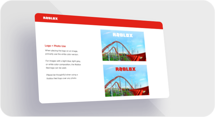 Logo + Photo Use When placing the logo on an image, primarily use the white color version. For images with a light blue, light grey, or white color composition, the Roblox Red logo can be used. Please be thoughtful when using a Roblox Red logo over any photo.