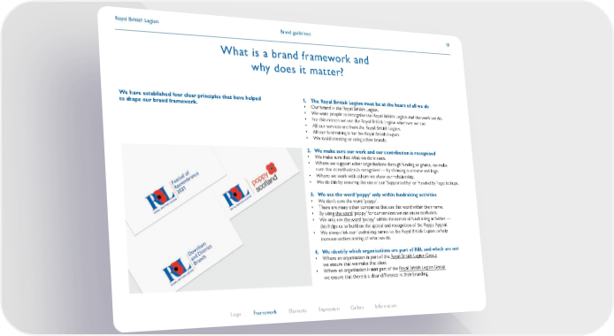 Brand guidelines Royal British Legion 19 We have established four clear principles that have helped to shape our brand framework. 1. T he Royal British Legion must be at the heart of all we do • O ur brand is the Royal British Legion. • W e want people to recognise the Royal British Legion and the work we do. • F or this reason we use the Royal British Legion wherever we can. • A ll our services are from the Royal British Legion. • A ll our fundraising is for the Royal British Legion. • W e avoid creating or using other brands. 2. W e make sure our work and our contribution is recognised • W e make sure that what we do is seen. • W here we support other organisations through funding or grants, we make s ure that contribution is recognised — by showing our name and logo. • W here we work with others we show our relationship. • W e do this by ensuring the use of our 'Supported by' or 'Funded by' logo lockups. 3. W e use the word ‘poppy’ only within fundraising activities • W e don’t own the word ‘poppy’. • T here are many other companies that use this word within their name. • B y using the word ‘poppy’ for our services we can cause confusion. • W e only use the word ‘poppy’ within the names of fundraising activities — t his helps us to build on the appeal and recognition of the Poppy Appeal. • W e always link our fundraising names to the Royal British Legion to help i ncrease understanding of what we do. 4. W e identify which organisations are part of RBL and which are not • W here an organisation is part of the Royal British Legion Group w e ensure that we make that clear. • W here an organisation is not part of the Royal British Legion Group w e ensure that there is a clear difference in their branding. Logo Framework Elements Expression Gallery Information What is a brand framework and why does it matter?