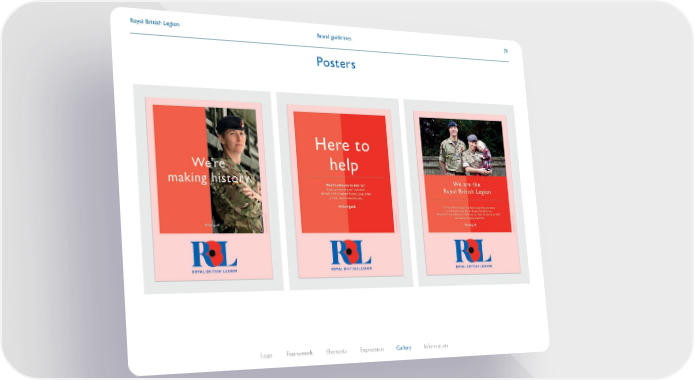 Royal British Legion Brand Book Page 70 Page 72Brand guidelines Royal British Legion 71 Posters Logo Framework Elements Expression Gallery Information