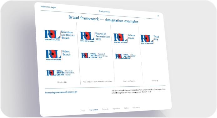 Brand guidelines Royal British Legion 21 Brand framework — designation examples Increasing awareness of what we do The above examples illustrate designations from our approved list of events and places, to build recognition and increase awareness of the work we do. Logo Framework Elements Expression Gallery Information and Distri ct Do wnha m Branch Br anch Riders and Distri ct Branch Do wnha m Membership Service and Support Hous e Ga lano s Hous e Ga lano s Sh op Po pp y Fundraising Rememb rance 202 Festival o f Rememb rance 202 Festival o f Remembrance and Commemorative events
