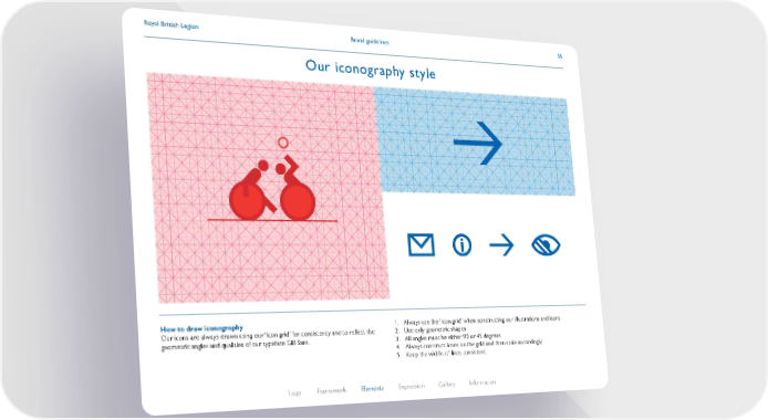 Brand guidelines Royal British Legion 35 Our iconography style How to draw iconography Our icons are always drawn using our ‘icon grid’ for consistency and to reflect the geometric angles and qualities of our typeface Gill Sans. 1. A lways use the ‘icon grid’ when constructing our illustrations and icons 2. U se only geometric shapes 3. A ll angles must be either 90 or 45 degrees 4. A lways construct icons on the grid and then scale accordingly 5. K eep the widths of lines consistent. Logo Framework Elements Expression Gallery Information