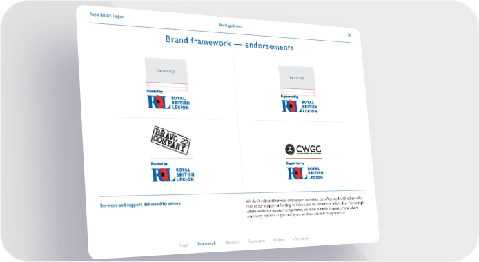 Brand guidelines Royal British Legion 24 Brand framework — endorsements Services and support delivered by others We don’t deliver all services and support ourselves, but often work with others who receive our support or funding. In these cases we ensure our role is clear. For example where we fund a recovery programme, we show our role ‘Funded by’ and where a recovery centre is supported by us, we show our role ‘Supported by’. Partner logo Partner logo Logo Framework Elements Expression Gallery Information
