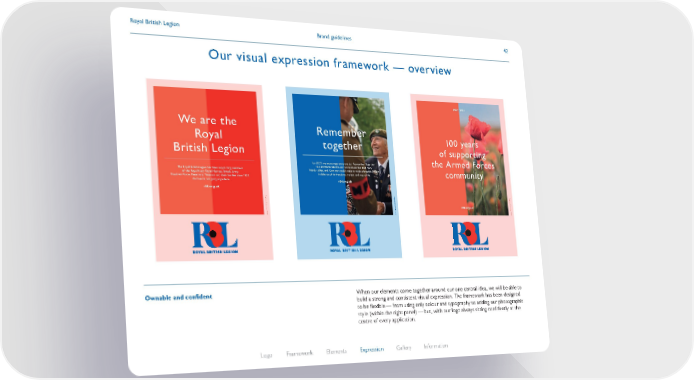 Brand guidelines Royal British Legion 42 Our visual expression framework — overview Ownable and confident When our elements come together around our one central idea, we will be able to build a strong and consistent visual expression. The framework has been designed to be flexible — from using only colour and typography to adding our photographic style (within the right panel) — but, with our logo always sitting confidently at the centre of every application. For 2021, we encourage everyone to ‘Remember Together’ to commemorate the service and sacrifice that many friends, allies, and Commonwealth nations made alongside Britain in defence of its freedoms, values, and way of life. rbl.org.uk For 2021, we encourage everyone to ‘Remember Together’ to commemorate the service and sacrifice that many friends, allies, and Commonwealth nations made alongside Britain in defence of its freedoms, values, and way of life. rbl.org.uk Remember together Registered charity number: 219279 100 years of supporting the Armed Forces community 1921 – 2021 rbl.org.uk Registered charity number: 219279 The Royal British Legion has been supporting members of the Royal Navy, Royal Marines, British Army, Royal Air Force, Reservists, Veterans and their families since 1921. And we’re not going anywhere. rbl.org.uk We are the Royal British Legion Registered charity number: 219279 Logo Framework Elements Expression Gallery Information