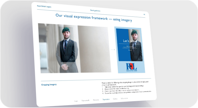 Brand guidelines Royal British Legion 44 Our visual expression framework — using imagery Cropping imagery Please consider the following when cropping images to place within the right panel of our visual framework. 1. T hink about where the type sits over the image and crop accordingly 2. A lways centre the subject within the crop 3. C lose crops focus the subject matter and are more dynamic 4. E nsure the crop helps create a strong holistic composition of each communication. Need some advice? If you are serving or have ever served in the Armed Forces, pop in for a chat, we’re here for you. rbl.org.uk Let’s talk Need some advice? If you are serving or have ever served in the Armed Forces, pop in for a chat, we’re here for you. rbl.org.uk Registered charity number: 219279 Let’s talk Logo Framework Elements Expression Gallery Information