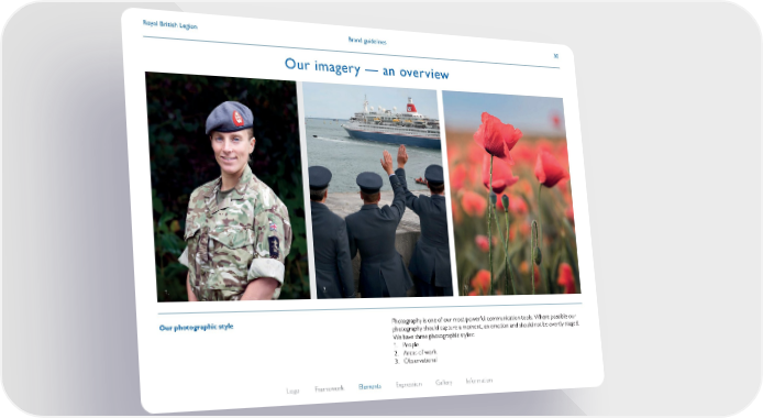 Brand guidelines Royal British Legion 30 1. 2. 3. Our photographic style Photography is one of our most powerful communication tools. Where possible our photography should capture a moment, an emotion and should not be overtly staged. We have three photographic styles: 1. P eople 2. A reas of work 3. O bservational Logo Framework Elements Expression Gallery Information Our imagery — an overview