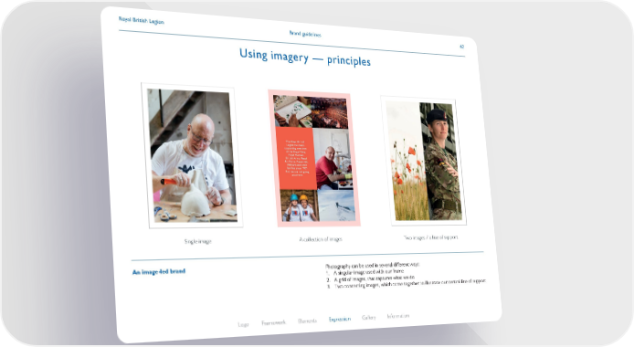 Brand guidelines Royal British Legion 62 Using imagery — principles We’re here for financial guidance If you’re having money issues, we’re here to help. Whether you are struggling with debt or emergency situations, need support setting up your new home or accessing benefits, our team have got you covered. If you have been injured or suffer from illness as a result of service, we can help with appeals to both the war pensions, Armed Forces compensation scheme. We’re also here to support you through every step of an independent inquest with support and guidance on legal procedures. We’ll help you live independently We know how important your home is and we’re here to keep you living independently for as long as possible. That’s why we offer support to veterans with mobility aids, 24 hour care phones, and make sure there is always someone to talk to. What’s more, we can help with home adaptations and maintenance. We’re here through life Our specialist residential care homes provide both long and short term care to members of the Armed Forces community and their dependants, helping you maintain your independence and live with like minded individuals. Additionally our team of admiral nurses offers practical, clinical and emotional support to families and carers of those with dementia. We’ll make sure you receive the highest quality support Quality support we’re experts in getting you back on your feet through a range of rehabilitation programmes across various sports and arts related activities. We’re also here to provide personalised support to veterans and their families in crisis. Finance | Employment Independent living | Care Recovery | Respite The Royal British Legion has been supporting members of the Royal Navy, Royal Marines, British Army, Royal Air Force, Reservists, Veterans and their families since 1921. And we are not going anywhere. Single image A collection of images Two images / a line of support An image-led brand Photography can be used in several different ways: 1. A s ingular image used with our frame 2. A g rid of images, that captures what we do 3. T wo connecting images, which come together to illustrate our central line of support Logo Framework Elements Expression Gallery Information