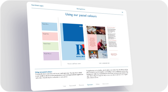 Brand guidelines Royal British Legion 54 Using our pastel colours Using our pastel colours Our pastel colours play a key role in our visual expression. They have been added to our toolkit to ensure we are perceived as a warm and approachable organisation. Each colour should only be used within its own palette. For applications such as leaflets, only the mid or core colours from the selected colour palette should be used for headlines, sub-headings or quotes and always used on white backgrounds. Body copy should always be set in black, as shown in the example on the right. When using text on pastels only use our core colours and ensure text is legible with sufficient contrast. The Royal British Legion has been supporting members of the Royal Navy, Royal Marines, British Army, Royal Air Force, Reservists, Veterans and their families since 1921. And we are not going anywhere. We’re here for financial guidance If you’re having money issues, we’re here to help. Whether you are struggling with debt or emergency situations, need support setting up your new home or accessing benefits, our team have got you covered. If you have been injured or suffer from illness as a result of service, we can help with appeals to both the war pensions, Armed Forces compensation scheme. We’re also here to support you through every step of an independent inquest with support and guidance on legal procedures. We’ll help you live independently We know how important your home is and we’re here to keep you living independently for as long as possible. That’s why we offer support to veterans with mobility aids, 24 hour care phones, and make sure there is always someone to talk to. What’s more, we can help with home adaptations and maintenance. We’re here through life Our specialist residential care homes provide both long and short term care to members of the Armed Forces community and their dependants, helping you maintain your independence and live with like minded individuals. Additionally our team of admiral nurses offers practical, clinical and emotional support to families and carers of those with dementia. We’ll make sure you receive the highest quality support Quality support we’re experts in getting you back on your feet through a range of rehabilitation programmes across various sports and arts related activities. We’re also here to provide personalised support to veterans and their families in crisis. Finance | Employment Independent living | Care Recovery | Respite Pastel Mauve Pastel Green Pastel Red Pastel Blue fl1111 If you are serving or have ever served in the Armed Forces, pop in for a chat, we’re here for you. rbl.org.uk Let’s talk Registered charity number: 219279 Inside communications Posters and front covers Logo Framework Elements Expression Gallery Information