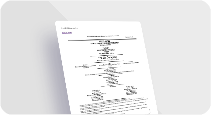 Table of Contents This is an initial public offering of Class A common stock by The We Company. The estimated initial public offering price is between $ and $ per share. We intend to apply to list our Class A common stock on the (the " ") under the symbol "WE". We have three classes of common stock: Class A common stock, Class B common stock and Class C common stock. The Class A common stock has one vote per share and the Class B common stock and Class C common stock (together, "high-vote stock") have twenty votes per share. Holders of our Class A common stock, Class B common stock and Class C common stock vote together as a single class on all matters, except as otherwise set forth in this prospectus or as required by applicable law. The holders of our outstanding shares of high-vote stock will hold approximately % of the voting power of our outstanding capital stock upon completion of this offering, and Adam Neumann, our Co-Founder and Chief Executive Officer, will hold or have the ability to control approximately % of the voting power of our outstanding capital stock upon completion of this offering. Following this offering, we will be a "controlled company" within the meaning of the corporate governance rules of the . We will be treated as an "emerging growth company" under the federal securities laws for certain purposes until we complete this offering. Investing in our Class A common stock involves risks. See "Risk factors" beginning on page 24. Neither the Securities and Exchange Commission nor any other regulatory body has approved or disapproved of these securities or passed upon the adequacy or accuracy of this prospectus. Any representation to the contrary is a criminal offense. (1) Assumes no exercise of the underwriters' option to purchase additional shares of our Class A common stock described below. (2) See "Underwriting" for a description of compensation payable to the underwriters. Per Share Total 1 Initial public offering price Underwriting discounts and commissions2 Proceeds to us, before expenses $ $ $ $ $ $ We have granted the underwriters an option for a period of 30 days following the date of this prospectus to purchase up to additional shares of Class A common stock. See "Underwriting". The underwriters expect to deliver the shares of Class A common stock to purchasers on , 2019. Prospectus dated , 2019. Class A Common Stock Shares Subject to completion, dated August 14, 2019 The information in this preliminary prospectus is not complete and may be changed. The securities may not be sold until the registration statement filed with the Securities and Exchange Commission is effective. This preliminary prospectus is not an offer to sell nor does it seek an offer to buy these securities in any jurisdiction where the offer or sale is not permitted. The We Company Goldman Sachs & Co. LLC BofA Merrill Lynch Barclays Citigroup Credit Suisse HSBC UBS Investment Bank Wells Fargo Securities J.P. Morgan