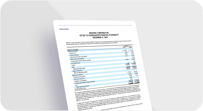 Table of Contents WEWORK COMPANIES INC. NOTES TO CONSOLIDATED FINANCIAL STATEMENTS DECEMBER 31, 2018 Deferred income taxes reflect the effect of temporary differences between the carrying amounts of assets and liabilities recognized for financial reporting purposes and the amounts recognized for tax purposes. The tax effects of the temporary differences were as follows: December 31, (Amounts in thousands) 2017 2018 Deferred tax assets: Deferred rent $ 419,864 $ 630,481 Accrued expenses 1,066 6,773 Deferred stock-based compensation 10,356 24,256 Deferred financing obligation 27,164 29,370 Unrealized gain (loss) on foreign exchange — 14,859 Net operating loss 230,750 563,955 Interest — 1,880 Other 3,036 5,580 Total deferred tax assets 692,236 1,277,154 Valuation allowance (401,460) (848,421) Total net deferred tax assets 290,776 428,733 Deferred tax liabilities: Property and equipment (271,003) (390,240) Finite-lived intangibles (14,839) (38,896) Indefinite-lived intangibles (8,205) (2,164) Unrealized gain (loss) on foreign exchange (925) — Other (273) — Total deferred tax liabilities (295,245) (431,300) Net deferred tax liability $ (4,469) $ (2,567) The Company records a valuation allowance in jurisdictions where it is more likely than not that deferred tax assets will not be realized. The Company’s three-year cumulative loss in its operations was significant negative evidence for the Company to record a full valuation allowance in most jurisdictions; however in certain jurisdictions, the Company did not record a valuation allowance where the Company had profitable operations, or recorded only a partial valuation allowance due to the existence of deferred tax liabilities that will partially offset the Company’s net operating loss carryforwards in future years. During the year ended December 31, 2018, the Company released $8.5 million of U.S. valuation allowance due to taxable temporary differences related to U.S. acquisitions. As of December 31, 2018, the Company had U.S. federal income tax net operating loss carryforwards of $1.5 billion, of which $789.7 million may be carried forward indefinitely and $732.2 million will begin to expire starting in 2033 if not utilized. The Company had U.S. state income tax net operating loss carryforwards of $1.2 billion with varying expiration dates, which will begin to expire starting in 2028 if not utilized. As of December 31, 2018, the Company had foreign net operating loss carryforwards of $604.0 million (with various expiration dates), of which approximately $313.0 million have indefinite carryforward periods. Certain of these federal, state and foreign net operating loss carryforwards may be subject to Internal Revenue Code Section 382 or similar provisions, which impose limitations on their utilization amounts. F-45