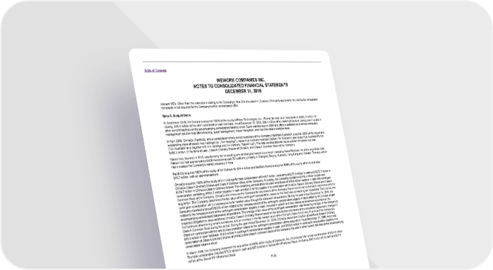 Table of Contents WEWORK COMPANIES INC. NOTES TO CONSOLIDATED FINANCIAL STATEMENTS DECEMBER 31, 2018 relevant VIEs. Other than the restrictions relating to the Company’s Asia JVs discussed in (1) above, third-party approval for the distribution of available net assets is not required for the Company’s other consolidated VIEs. Note 6. Acquisitions In September 2018, the Company acquired 100% of the equity of Teem Technologies, Inc. (“Teem”) for total cash consideration of $94.2 million. At closing, $18.4 million of the cash consideration was held back. As of December 31, 2018, $18.4 million of the cash held back at closing was included in other current liabilities on the accompanying consolidated balance sheet. Teem was founded in 2009 and offers a software-as-a-service workplace management solution that offers booking, guest management, indoor navigation, and real-time space analytics tools. In April 2018, ChinaCo, PacificCo, and a consolidated wholly owned subsidiary of the Company (“WeWork Australia”), acquired 100% of the issued and outstanding stock of naked Hub Holdings Ltd. (“NH Holdings”), naked Hub Vietnam Holdings Limited (“NH Vietnam”), and naked Hub Australia Pty Ltd (“NH Australia” and, together with NH Holdings and NH Vietnam, “Naked Hub”). The total consideration for the acquisition of Naked Hub was $480.3 million, in the form of cash, Class A Ordinary Shares of ChinaCo, and Class A Common Stock of the Company. Naked Hub, founded in 2015, was formerly the co-working arm of Shanghai-based luxury resort company Naked Retreats. As of the acquisition date, Naked Hub had approximately 8,000 members across 25 locations, primarily in Shanghai, Beijing, Australia, Hong Kong and Vietnam. This acquisition has increased the Company’s market presence in Asia. PacificCo acquired 100% of the equity of NH Vietnam for $14.4 million and WeWork Australia acquired 100% of the equity of NH Australia for $16.2 million, both all cash transactions. ChinaCo acquired 100% of the equity of NH Holdings for total consideration of $449.7 million, consisting of $177.0 million in cash and $272.7 million in ChinaCo Class A Ordinary Shares and Class A Common Stock of the Company. At closing, the Company transferred $146.3 million in cash and $179.7 million in ChinaCo Class A Ordinary Shares. The remaining consideration included a holdback of $15.9 million payable in cash and contingent consideration consisting of $14.7 million payable in cash and $93.1 million payable in a combination of ChinaCo Class A Ordinary Shares and Class A Common Stock of the Company. ChinaCo will reimburse the Company for any shares of the Company issued on ChinaCo’s behalf in connection with the acquisition. The Company determined the fair value of the contingent consideration, based on the likelihood of reaching set milestones. Each period, the contingent consideration will be remeasured to fair market value through the statement of operations. During the year ended December 31, 2018, the Company recorded a loss of $(80.6) million related to the remeasurement of the contingent consideration payable in stock offset by $4.2 million of gain related to the remeasurement of the contingent consideration payable in cash, included in growth and new market development expenses on the accompanying consolidated statements of operations. The change in fair value of the contingent consideration was driven by changes in the Company’s projected obligation to issue additional ChinaCo Class A Ordinary Shares based on the anti-dilution provisions of the acquisition agreement, changes in the likelihood of achieving certain milestones, and an increase in the fair market value of the ChinaCo Class A Ordinary Shares and the Company’s Class A Common Stock during the period. During the year ended December 31, 2018, ChinaCo issued $44.0 million of additional Class A Ordinary Shares in connection with the anti-dilution protection related to the contingent consideration of this acquisition. As of December 31, 2018, there was $15.9 million in cash holdback, $10.5 million in contingent consideration payable in cash, and $129.8 million in contingent consideration payable in a combination of Class A Ordinary Shares of ChinaCo and Class A Common Stock of the Company included in other current liabilities on the accompanying consolidated balance sheet. In March 2018, the Company completed the acquisition of 100% of the equity of Conductor, Inc. (“Conductor”) for a total consideration of $113.6 million. The total consideration included $15.8 million in cash and $97.8 million in Series AP-1 Preferred Stock. At closing, $0.2 million of the cash and $31.6 million of the Series AP-1 Preferred Stock F-29