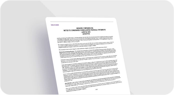 Table of Contents WEWORK COMPANIES INC. NOTES TO CONDENSED CONSOLIDATED FINANCIAL STATEMENTS JUNE 30, 2019 (UNAUDITED) reporting periods beginning after January 1, 2019 are presented under ASC 606 while prior period amounts are not adjusted and continue to be reported in accordance with Topic 605. Other than the policies discussed below, and as otherwise discussed in Note 2, no material changes have been made to the Company’s significant accounting policies disclosed in Note 2, Summary of Significant Accounting Policies, in its Annual Report for the year ended December 31, 2018 as it relates to revenue recognition. The Company recognizes revenue under the five-step model required under ASC 606, which requires the Company to identify the relevant contract with the customer, identify the performance obligations in the contract, determine the transaction price, allocate the transaction price to the performance obligations identified and recognize revenue when (or as) each performance obligation is satisfied. The Company’s primary revenue categories, related performance obligations, and associated recognition patterns are as follows: Membership and Service Revenue—The Company sells memberships to individuals and organizations that provide access to office space, use of a shared internet connection, access to certain facilities (kitchen, common areas, etc.), a monthly allowance of conference room reservation hours, printing and copying and access to the WeWork mobile application. The price of each membership is based on factors such as the particular characteristics of the workspace occupied by the member, the geographic location of the workspace, and the size of the workspace. The membership contracts may contain renewal options that may be exercised at the discretion of the member to extend the term beyond the initial term. Membership revenue consists primarily of fees from members, net of discounts, and is recognized over time, evenly on a ratable basis, over the life of the agreement, as services are provided and the performance obligation is satisfied. All services included in a monthly membership allowance that remain unused at the end of a given month expire. Certain of the Company’s membership contracts with its members relate to “configured” workspaces which meet the definition of operating leases under ASC 840 and 842. The Company had approximately $20 million and $109 million in membership revenue for the six months ended June 30, 2018 and 2019, respectively, related to subleases and membership contracts accounted for as leases in accordance with ASC 840 during 2018 and ASC 842 during 2019. The Company has elected not to separate non-lease components from lease components for all membership agreements with configured workspaces. The revenue recognized under ASC 842 is recognized evenly on a ratable basis over the term of the arrangement, consistent with the revenue recognition pattern for the membership services arrangements accounted for under ASC 606. Service revenue consists of additional billings to members for the ancillary services they may access through their memberships in excess of monthly allowances included in membership revenue, commissions earned by the Company on various services and benefits provided to our members and management fee income for services provided to unconsolidated locations in India. Members may elect whether they want to add-on additional services at the inception of their agreement. Additional fees for add-on services are included in the transaction price when elected by the member. To the extent a member elects an add-on service subsequent to the commencement of a commitment period, the additional add-on fee will be added to transaction price at that point in time. Other Revenue—Other revenue includes income generated from sponsorships and ticket sales from WeWork branded events and is recognized upon the occurrence of the event. Other revenue also includes other management and advisory fees earned, design fees earned and revenue generated from various We Company offerings. The Company recognizes these revenues over time, on a monthly basis, as the services are performed. Other revenue also includes revenue earned for design and development services performed, which are recognized as revenue over time based on a percentage of contract costs incurred to date compared to the total estimated contract cost. The Company identifies only the specific costs incurred which contribute to the Company’s progress in satisfying F-85