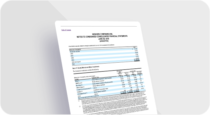 Table of Contents WEWORK COMPANIES INC. NOTES TO CONDENSED CONSOLIDATED FINANCIAL STATEMENTS JUNE 30, 2019 (UNAUDITED) Amortization expense related to intangible assets as of June 30, 2019 is expected to be as follows: (Amounts in thousands) Total Remainder of 2019 $ 24,402 2020 42,115 2021 30,978 2022 17,681 2023 12,784 2024 and beyond 48,313 Total $ 176,273 Note 11. Equity Method and Other Investments The Company’s investments consists of the following: December 31, 2018 June 30, 2019 (Amounts in thousands, except percentages) Carrying Carrying Cost Percentage Investee Investment Type Value Value Basis Ownership (1) DSQ Equity method investment / Note receivable 52,291 50,218 53,067 10% (2) WPI Fund Equity method investment 66,592 17,440 15,568 4% (3) The Wing Equity method investment / Equity securities 59,163 58,837 52,000 23% (4) Waller Creek Equity method investment 6,464 10,072 9,908 8% (5) Creator Fund Investments Various 28,008 40,604 41,661 Various (6) IndiaCo Investment in convertible notes 5,319 5,544 5,248 N/A (7) Ark Master Fund Equity method investment — 691 691 2% Other Various 598 2,603 2,754 Various Total equity method and other investments $ 218,435 $ 186,009 $ 180,897 (1) During 2018, a venture in which the Company owns a 10% equity interest closed on the acquisition of a commercial real estate portfolio located in London, United Kingdom (“DSQ”). The investment balance as of June 30, 2019, includes a note receivable with an outstanding balance of $25.0 million that accrues interest at a rate of 6.08% and matures in April 2028. The remaining $25.2 million investment is the carrying value of the Company’s equity method investment. The Company was a tenant in one of the properties within DSQ prior to the acquisition by the joint venture and subsequent to the acquisition the Company has signed new leases for additional space in other locations within DSQ. See Note 22 for additional details. (2) During 2017, the Company subscribed for a total of $27.0 million in capital commitments to a new real estate investment fund (the “WPI Fund”), including its commitments as a 50% owner of the unconsolidated entity that is the general partner of the WPI Fund and its commitments as a limited partner of the WPI Fund. The Company is also a 50% owner in the unconsolidated entity that is the asset manager for the WPI Fund. The other 50% owner of both the general partner and the asset manager of the WPI Fund is an affiliate of Rhone Group LLC. Rhone Group LLC is also a shareholder of the Company and Rhone Group LLC’s controlling member is also a director of the Company. Of the total capital commitments, the Company had funded approximately $15.5 million as of June 30, 2019. During 2018, the Company also funded an additional $50.0 million in exchange for a convertible note to a wholly-owned subsidiary of the WPI Fund. In February 2019, this note converted into a 17.4% equity interest in the Company’s consolidated 424 Fifth Venture as discussed in Note 7. The WPI Fund’s focus is acquiring, developing and managing office assets with current or expected vacancy suitable for WeWork occupancy, currently primarily focusing on opportunities in North America and Europe. (3) During 2017, the Company acquired a 25% interest, comprised of common and preferred shares, in Refresh Club, Inc. (“The Wing”) for $38.0 million, which was accounted for as an equity method investment. The Wing is a network of co-working and community spaces for women and its mission is to create space for women to advance their pursuits and build community together. During 2018, the Company acquired an additional $14.0 million of preferred shares in connection with a new round of financing by The Wing, which resulted in the Company’s ownership decreasing to 23%. The preferred shares, including both the preferred shares acquired during 2017 and the preferred shares acquired during 2018, were determined to be equity securities without a readily determinable fair value and are measured using the measurement alternative. The common shares acquired during 2017 remained an equity method investment. As this additional round of financing in 2018 represented an orderly F-102