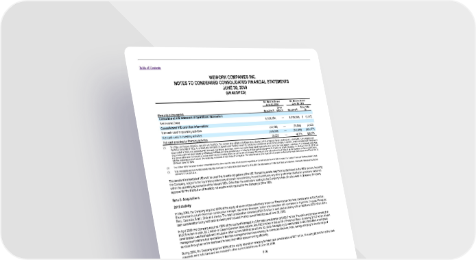 Table of Contents WEWORK COMPANIES INC. NOTES TO CONDENSED CONSOLIDATED FINANCIAL STATEMENTS JUNE 30, 2019 (UNAUDITED) Six Months Ended Six Months Ended June 30, 2018 June 30, 2019 Other Other VIEs (1) (2) (1) (Amounts in thousands) Asia JVs VIEs Asia JVs (2) Consolidated VIE statement of operations information: Net income (loss) $(128,254) — $(169,289) $ (3,337) Consolidated VIE cash flow information: Net cash used in operating activities (42,496) — (76,568) (3,422) Net cash used in investing activities (336,036) — (243,896) (893,477) Net cash provided by financing activities 20,223 — 48,774 889,371 (1) The “Asia JVs” include ChinaCo, JapanCo and PacificCo. The consent of an affiliate of SoftBank Group Capital Limited is required for any dividends to be distributed by the JapanCo and PacificCo consolidated VIEs. As a result, any net assets of JapanCo and PacificCo would be considered restricted net assets to the Company. In addition, certain subsidiaries of ChinaCo are incorporated in China and subject to PRC laws and regulations, as a result, assets may not be freely transferable to the U.S. due to the local laws and restrictions. The net assets of the Asia JVs include preferred stock issued to affiliates of SoftBank and other investors that includes liquidation preferences totaling $1.6 billion as of both December 31, 2018 and June 30, 2019, and are redeemable upon the occurrence of an event that is not solely within the control of the Company. After reducing the net assets of each Asia JV by the liquidation preference associated with the redeemable stock issued, the remaining net assets of each Asia JV is negative. The initial issuance price equals the liquidation preference for each share issued as of December 31, 2018 and June 30, 2019. (2) The “Other VIEs” includes all other consolidated VIEs, other than the Asia JVs discussed separately in (1) and include the 424 Fifth Venture, the Creator Fund and WeWork Waller Creek. (3) Total net assets represents total assets less total liabilities and redeemable stock issued by VIEs after the total assets and total liabilities have both been reduced to remove amounts that eliminate in consolidation. The assets of consolidated VIEs will be used first to settle obligations of the VIE. Remaining assets may then be distributed to the VIEs’ owners, including the Company, subject to the liquidation preferences of certain noncontrolling interest holders and any other preferential distribution provisions contained within the operating agreements of the relevant VIEs. Other than the restrictions relating to the Company’s Asia JVs discussed in (1) above, third-party approval for the distribution of available net assets is not required for the Company’s Other VIEs. Note 8. Acquisitions 2019 Activity In May 2019, the Company acquired 100% of the equity of seven entities collectively known as “Emprenurban” for total consideration of $33.5 million. Emprenurban is a Latin American construction manager, real estate developer, builder and consultant with operations in Argentina, Uruguay, Paraguay, Peru, Colombia, Brazil, Chile and Mexico. The total consideration consisted of $31.5 million in cash paid at closing with an additional $2.0 million of the cash consideration being held back at closing and included in other current liabilities as of June 30, 2019. In April 2019, the Company acquired 100% of the equity of Managed by Q for total consideration of $189.7 million. The total consideration consisted of $107.5 million in cash, $0.2 million in Class A Common Stock options, and $82.0 million in Series AP-3 Preferred Stock. At closing, $18.7 million of cash consideration was held back and included in other current liabilities as of June 30, 2019. Managed by Q was founded in 2013 and offers a workplace management platform that specializes in facilities management services whereby its clients can discover, book, manage and pay for a wide range of services through an online dashboard to keep their office spaces running efficiently. During 2019, the Company acquired 100% of the equity of another company for total cash consideration of $5.7 million. At closing $0.6 million of the cash proceeds were held back and are included in other current liabilities as of June 30, 2019. F-98