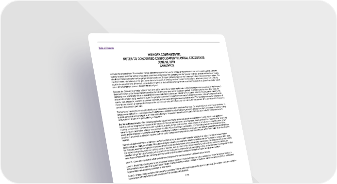 Table of Contents WEWORK COMPANIES INC. NOTES TO CONDENSED CONSOLIDATED FINANCIAL STATEMENTS JUNE 30, 2019 (UNAUDITED) estimate the expected term. The simplified method defines the expected term as the average of the contractual term and the vesting period. Estimated volatility is based on similar entities whose stock prices are publicly traded. The Company uses the historical volatilities of similar entities due to the lack of sufficient historical data for the Company’s common stock price. Dividend yields are based on the Company’s history and expected future actions. The risk-free interest rate is based on the yield curve of a zero-coupon U.S. Treasury bond on the date the stock option award was granted with a maturity equal to the expected term of the stock option award. All grants of stock options generally have an exercise price equal to or greater than the fair market value of the Company’s common stock on the date of grant. Because the Company is privately held and there is no public market for our stock, the fair value of the Company’s equity is approved by the Company’s Board of Directors or the Compensation Committee thereof at the time stock-based awards are granted. In estimating the fair value of our stock, the Company uses a third-party valuation specialist and considers factors it believes are material to the valuation process, including but not limited to, the price at which recent equity was issued by the Company to independent third parties or transacted between third parties, actual and projected financial results, risks, prospects, economic and market conditions, and estimates of weighted average cost of capital. The Company believes the combination of these factors provides an appropriate estimate of the expected fair value of the Company and reflects the best estimate of the fair value of the Company’s common stock at each grant date. The Company has elected to recognize forfeitures of stock-based compensation awards as they occur. For awards subject to performance conditions, no compensation cost will be recognized before the performance condition is probable of being achieved. Recognition of any compensation expense relating to stock grants that vest contingent on an initial public offering or “Acquisition” (as defined in the 2015 Plan detailed in Note 20) will be deferred until consummation of such initial public offering or Acquisition. Fair Value Measurements—The Company applies fair value accounting for all financial assets and liabilities and certain non-financial assets and liabilities that are recognized or disclosed at fair value in the financial statements on a recurring basis. Assets and liabilities measured at fair value every reporting period include investments in cash equivalents, available-for-sale debt securities, certain embedded derivatives requiring bifurcation, certain warrants issued classified as a liability in accordance with ASC 480, and contingent consideration liabilities relating to business combinations. Other assets and liabilities are subject to fair value measurements only in certain circumstances, including purchase accounting applied to assets and liabilities acquired in a business combination, impaired cost and equity method investments and long-lived assets that are written down to fair value when they are impaired. Fair value is defined as the price that would be received from selling an asset or paid to transfer a liability in an orderly transaction between market participants at the measurement date. When determining fair value measurements for assets and liabilities that are required to be recorded at fair value, the Company assumes the highest and best use of non-financial assets by market participants and the market-based risk measurements or assumptions that market participants would use in pricing assets or liabilities, such as inherent risk, transfer restrictions, and credit risk. Assets and liabilities are classified using a fair value hierarchy, which prioritizes the inputs used to measure fair value according to three levels, and bases the categorization of fair value measurements within the hierarchy upon the lowest level of input that is available and significant to the fair value measurement: Level 1—Observable inputs that reflect quoted prices (unadjusted) for identical assets or liabilities in active markets. Level 2—Inputs that reflect quoted prices for identical assets or liabilities in markets that are not active, quoted prices for similar assets or liabilities in active markets, inputs other than quoted prices that are observable for the assets or liabilities, or inputs that are derived principally from or corroborated by observable market data by correlation or other means. Level 3—Unobservable inputs that the Company incorporates in its valuation techniques used to determine fair value. These assumptions are required to be consistent with market participant assumptions that are reasonably available. F-78