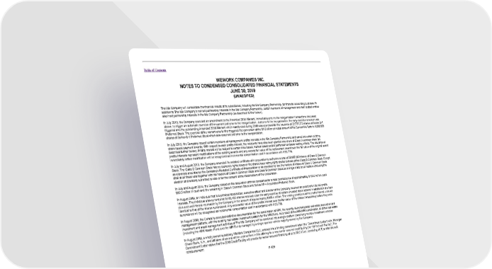 Table of Contents WEWORK COMPANIES INC. NOTES TO CONDENSED CONSOLIDATED FINANCIAL STATEMENTS JUNE 30, 2019 (UNAUDITED) The We Company will consolidate the financial results of its subsidiaries, including the We Company Partnership, for financial accounting purposes. In addition to The We Company’s indirect partnership interests in the We Company Partnership, certain members of management and their related entities also hold partnership interests in the We Company Partnership (as described further below). In July 2019, the Company executed an amendment to the Amended 2018 Warrant, immediately prior to the reorganization transactions discussed above, to trigger an automatic exercise of the warrant just prior to the reorganization. Just prior to the reorganization, the early exercise provision was triggered and the outstanding Amended 2018 Warrant which was funded during 2019 was exercised for the issuance of 22,727,273 shares of Series G-1 Preferred Stock. The exercise of the warrant also further triggered the conversion of the $1.0 billion principal amount of the Convertible Note to 9,090,909 shares of Series G-1 Preferred Stock which also occurred just prior to the reorganization. In July 2019, the Company issued certain members of management profits interests in the We Company Partnership and cancelled certain existing share-based payment awards. With respect to each profits interest, the recipients have also been granted one share of Class C common stock (as described further below). Profits interest will be subject to certain time based, market-based and/or performance-based vesting criteria. The issuance of profits interests represent modifications of the existing awards and any excess fair value of the replacement award over the fair value of the original award immediately before modification will be recognized as incremental compensation cost in accordance with ASC 718. In July and August 2019, the Company amended its restated certificate of incorporation to authorize a total of 50,967,800 shares of Class C Common Stock. The Class C Common Stock has no economic rights however the shares have voting rights similar to those of the Class B Common Stock. Except as expressly provided by the Company’s Restated Certificate of Incorporation or as provided by law, the holders of shares of Class C Common Stock shall at all times vote together with the holders of Class A Common Stock and Class B Common Stock as a single class on all matters (including the election of directors) submitted to vote or for the consent of the stockholders of the Corporation. In July and August 2019, the Company closed on the acquisition of three companies for a total contract price of approximately $120.0 million, paid $60.0 million in cash and the remaining in Class A Common Stock and Series AP-4 Acquisition Preferred Stock. In August 2019, an individual that is a principal stockholder, executive officer and director of the Company received an award of 9,438,483 profits interests. The individual also surrendered 9,438,483 shares received upon his early exercise of certain unvested stock options in satisfaction of a loan plus accrued interest receivable by the Company in the amount of approximately $365.4 million. The vesting provisions of the profits interest units are identical to that of the shares surrendered. Any excess fair value of the profits interest over the fair value of the shares immediately before they were surrendered will be recognized as incremental compensation cost in accordance with ASC 718. In August 2019, the Company executed definitive documentation for the combination of ARK, the recently launched global real estate acquisition and management platform, with the existing real estate investment platform for the WPI Fund. As a result of the ARK/WPI combination, all of the real estate investment and asset management activities of The We Company will be combined into a single platform comprising multiple investment vehicles (including the ARK Master Fund and the WPI Fund) managed by a single sponsor vehicle majority-owned by the Company. In August 2019, a wholly owned subsidiary, WeWork Companies LLC, entered into a binding commitment letter (the “Commitment Letter”) with JPMorgan Chase Bank, N.A., and affiliates of several of the underwriters in this offering for a new senior secured credit facility (the “2019 Credit Facility”). The Commitment Letter states that the 2019 Credit Facility will provide for senior secured financing of up to $6.0 billion, consisting of (1) a letter of credit reimbursement F-129