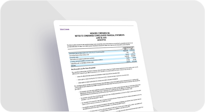 Table of Contents WEWORK COMPANIES INC. NOTES TO CONDENSED CONSOLIDATED FINANCIAL STATEMENTS JUNE 30, 2019 (UNAUDITED) The following table presents the total weighted-average number of potentially dilutive shares that were excluded from the computation of diluted net loss per share attributable to Class A and Class B common stockholders because their effect would have been anti-dilutive for the periods presented: Six Months Ended June 30, 2018 2019 Convertible Preferred Stock Series A, B, C, D-1, D-2, E, F, G, and Acquisition 170,990,896 172,145,245 Convertible Preferred Stock Series Junior 1,500 1,500 Convertible notes 785,302 9,876,211 Stock options not subject to performance conditions 15,666,935 18,086,053 Unvested restricted stock/RSUs not subject to performance conditions 768,665 876,088 Vested RSUs with non-forfeitable dividend rights 231,883 391,985 Warrants 1,566,576 16,703,009 Pro Forma Net Loss Per Share (Unaudited) The unaudited pro forma basic and diluted net loss per share attributable to Class A and Class B common stockholders for the six months ended June 30, 2019 has been prepared to give effect to adjustments to the numerator in the pro forma basic and diluted net loss per share calculation to: • remove the effect of interest expense and amortization of debt discount for the Convertible Note; • remove gains or losses resulting from the remeasurement of the embedded derivative related to the Convertible Note; • remove gains or losses resulting from the remeasurement of the Amended 2018 Warrant; The unaudited pro forma net basic and diluted net loss per share attributable to Class A and Class B common stockholders for the six months ended June 30, 2019 has been prepared to give effect to adjustments to the denominator in the pro forma basic and diluted net income per share calculation to give effect to: • the automatic conversion of all outstanding convertible preferred stock into Class A common stock other than our Junior Preferred Stock which automatically converts to Class B common stock in connection with a qualifying initial public offering. The Company used the if-converted method as though the conversion had occurred as of the beginning of the period or the original date of issuance, if later; • the automatic conversion of our Convertible Note that would have ultimately automatically converted into Class A common stock, if not earlier converted in July 2019 as discussed in Note 25; • the conversion of the convertible note that is convertible into shares of Series C Preferred stock that will ultimately automatically convert into Class A common stock at a conversion price of $5.36 per share; • the automatic exercise of the Amended 2018 Warrant, that would have ultimately automatically converted into Class A common stock at a conversion price of $110 per share, if not earlier converted in July 2019 as discussed in Note 25. • the issuance of common stock upon the vesting and settlement of RSUs for which the service-based vesting condition was satisfied as of June 30, 2019 and the qualifying event-based vesting condition will be satisfied in connection with an IPO. The liquidation and dividend rights are identical among Class A and Class B common stock, and both classes of common stock share equally in our earnings and losses. F-127