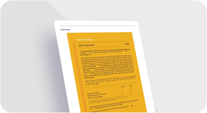 Table of Contents This is an initial public offering of Class A common stock by The We Company. The estimated initial public offering price is between $ and $ per share. We intend to apply to list our Class A common stock on the (the " ") under the symbol "WE". We have three classes of common stock: Class A common stock, Class B common stock and Class C common stock. The Class A common stock has one vote per share and the Class B common stock and Class C common stock (together, "high-vote stock") have twenty votes per share. Holders of our Class A common stock, Class B common stock and Class C common stock vote together as a single class on all matters, except as otherwise set forth in this prospectus or as required by applicable law. The holders of our outstanding shares of high-vote stock will hold approximately % of the voting power of our outstanding capital stock upon completion of this offering, and Adam Neumann, our Co-Founder and Chief Executive Officer, will hold or have the ability to control approximately % of the voting power of our outstanding capital stock upon completion of this offering. Following this offering, we will be a "controlled company" within the meaning of the corporate governance rules of the . We will be treated as an "emerging growth company" under the federal securities laws for certain purposes until we complete this offering. Investing in our Class A common stock involves risks. See "Risk factors" beginning on page 24. Neither the Securities and Exchange Commission nor any other regulatory body has approved or disapproved of these securities or passed upon the adequacy or accuracy of this prospectus. Any representation to the contrary is a criminal offense. (1) Assumes no exercise of the underwriters' option to purchase additional shares of our Class A common stock described below. (2) See "Underwriting" for a description of compensation payable to the underwriters. Per Share Total 1 Initial public offering price Underwriting discounts and commissions2 Proceeds to us, before expenses $ $ $ $ $ $ We have granted the underwriters an option for a period of 30 days following the date of this prospectus to purchase up to additional shares of Class A common stock. See "Underwriting". The underwriters expect to deliver the shares of Class A common stock to purchasers on , 2019. Prospectus dated , 2019. Class A Common Stock Shares Subject to completion, dated August 14, 2019 The information in this preliminary prospectus is not complete and may be changed. The securities may not be sold until the registration statement filed with the Securities and Exchange Commission is effective. This preliminary prospectus is not an offer to sell nor does it seek an offer to buy these securities in any jurisdiction where the offer or sale is not permitted. The We Company Goldman Sachs & Co. LLC BofA Merrill Lynch Barclays Citigroup Credit Suisse HSBC UBS Investment Bank Wells Fargo Securities J.P. Morgan