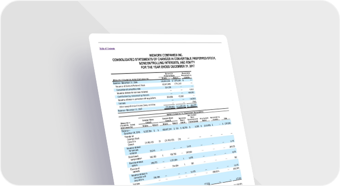 Table of Contents WEWORK COMPANIES INC. CONSOLIDATED STATEMENTS OF CHANGES IN CONVERTIBLE PREFERRED STOCK, NONCONTROLLING INTERESTS, AND EQUITY FOR THE YEAR ENDED DECEMBER 31, 2017 Convertible Redeemable Preferred Stock Noncontrolling (Amounts in thousands, except share amounts) Shares Amount Interests Balance—December 31, 2016 136,902,228 $ 1,678,301 $ — Issuance of Series G Preferred Stock 32,812,199 1,714,242 — Conversion of convertible note 334,228 — — Issuance of stock for services rendered — — 4,840 Contributions by noncontrolling interests — — 900,003 Issuance of stock in connection with acquisitions 251,968 12,892 — Net loss — — (49,500) Other comprehensive income (loss), net of tax — — (766) Balance—December 31, 2017 170,300,623 $ 3,405,435 $ 854,577 WeWork Companies, Inc. Shareholders’ Equity (Deficit) Accumulated Common Stock Common Stock (Amounts in Additional Other Class A Class B thousands, except Paid-In Comprehensive Accumulated Noncontrolling share amounts) Shares Amount Shares Amount Capital Income (Loss) Deficit Interests Total Balance— December 31, 2016 8,227,764 $ 8 150,617,244 $ 151 $ 86,769 $ 8,005 $ (816,499) $ — $ (721,566) Transfer of Common Stock Class B to Class A 21,119,429 21 (21,119,429) (21) — — — — — Issuance of stock for services rendered 36,018 — — — 3,415 — — — 3,415 Stock-based compensation 310,153 1 150,700 — 297,869 — — — 297,870 Exercise of stock options 368,070 — 1,373,984 1 8,675 — — — 8,676 Exercise of warrants — — 764,954 1 601 — — — 602 Issuance of stock in connection with acquisitions 238,108 — — — 10,475 — — — 10,475 Net loss — — — — — — (883,994) — (883,994) Other comprehensive income (loss), net of tax — — — — — (17,929) — — (17,929) Balance— December 31, 2017 30,299,542 $ 30 131,787,453 $ 132 $407,804 $ (9,924) $ (1,700,493) $ — $(1,302,451) The accompanying notes are an integral part of these consolidated financial statements. F-8