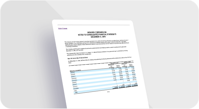 Table of Contents WEWORK COMPANIES INC. NOTES TO CONSOLIDATED FINANCIAL STATEMENTS DECEMBER 31, 2018 The Company has not recorded deferred income taxes applicable to the undistributed earnings of its foreign subsidiary that are indefinitely reinvested in foreign operations. Any undistributed earnings will be used to fund international operations and to make investments outside of the United States. Withholding taxes may be payable on future distributions. Deferred income taxes also have not been recorded on any outside basis differences inherent in the foreign subsidiaries. The Company went through an analysis of its various tax positions and did not identify any material uncertain tax positions for the years ended December 31, 2016, 2017 and 2018. The Company files income tax returns in U.S. federal, U.S. state and foreign jurisdictions. All tax years remain open to examination by the taxing authorities due to the Company’s NOL carryforwards. Note 19. Convertible Preferred Stock As of December 31, 2016, 2017 and 2018, the Company had outstanding the following series of convertible preferred stock, each par value $0.001 per share: December 31, 2016 December 31, 2017 Shares Issued Shares Issued and Carrying and Carrying (Amounts in thousands) Outstanding Amount Outstanding Amount Series A 38,393 $ 17,350 38,393 $ 17,350 Series B 22,165 40,995 22,165 40,995 Series C 28,070 154,699 28,404 154,699 Series D-1 11,939 198,541 11,939 198,541 Series D-2 9,380 155,996 9,380 155,996 Series E 13,194 433,507 13,194 433,507 Series F 13,759 675,913 13,759 675,913 Series G — — 33,065 1,727,134 Acquisition — — — — Junior 2 1,300 2 1,300 Total 136,902 $ 1,678,301 170,301 $ 3,405,435 F-46