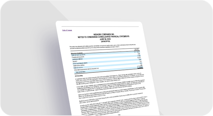 Table of Contents WEWORK COMPANIES INC. NOTES TO CONDENSED CONSOLIDATED FINANCIAL STATEMENTS JUNE 30, 2019 (UNAUDITED) The preliminary allocation of the total acquisition consideration during the six months ended June 30, 2019 is estimated as follows (amounts below exclude the asset acquisitions acquired by non-wholly owned subsidiaries separately disclosed in Note 7): Total 2019 (Amounts in thousands) Acquisitions Cash and cash equivalents $ 16,237 Property and equipment 2,558 Capitalized software 24,000 Goodwill 183,357 Finite-lived intangible assets 2,800 Deferred tax liabilities (218) Deferred revenue (623) Other assets acquired and liabilities assumed, net 836 Total consideration $ 228,947 2018 Activity In September 2018, the Company acquired 100% of the equity of Teem Technologies, Inc. (“Teem”) for total cash consideration of $94.2 million. At closing, $18.4 million of the cash consideration was held back and included in other current liabilities as of December 31, 2018 and June 30, 2019 on the accompanying condensed consolidated balance sheets. Teem was founded in 2009 and offers a software-as-a-service workplace management solution that offers booking, guest management, indoor navigation, and real-time space analytics tools. In April 2018, ChinaCo, PacificCo, and a consolidated wholly owned subsidiary of the Company (“WeWork Australia”), acquired 100% of the issued and outstanding stock of naked Hub Holdings Ltd. (“NH Holdings”), naked Hub Vietnam Holdings Limited (“NH Vietnam”), and naked Hub Australia Pty Ltd (“NH Australia” and, together with NH Holdings and NH Vietnam, “Naked Hub”). The total consideration for the acquisition of Naked Hub was $480.3 million, in the form of cash, Class A Ordinary Shares of ChinaCo, and Class A Common Stock of the Company. Naked Hub, founded in 2015, was formerly the co-working arm of Shanghai-based luxury resort company Naked Retreats. As of the acquisition date, Naked Hub had approximately 8,000 members across 25 locations, primarily in Shanghai, Beijing, Australia, Hong Kong and Vietnam. This acquisition has increased the Company’s market presence in Asia. PacificCo acquired 100% of the equity of NH Vietnam for $14.4 million and WeWork Australia acquired 100% of the equity of NH Australia for $16.2 million, both all cash transactions. ChinaCo acquired 100% of the equity of NH Holdings for total consideration of $449.7 million, consisting of $177.0 million in cash and $272.7 million in ChinaCo Class A Ordinary Shares and Class A Common Stock of the Company. At closing, the Company transferred $146.3 million in cash and $179.7 million in ChinaCo Class A Ordinary Shares. The remaining consideration included a holdback of $15.9 million payable in cash and contingent consideration consisting of $14.7 million payable in cash and $93.1 million payable in a combination of ChinaCo Class A Ordinary Shares and Class A Common Stock of the Company. ChinaCo will reimburse the Company for any shares of the Company issued on ChinaCo’s behalf in connection with the acquisition. The Company determined the fair value of the contingent consideration, based on the likelihood of reaching set milestones. Each period, the contingent consideration will be remeasured to fair market value through the statement of operations. During the six months ended June 30, 2019, the Company recorded a gain of $44.1 million related to the remeasurement of the F-99