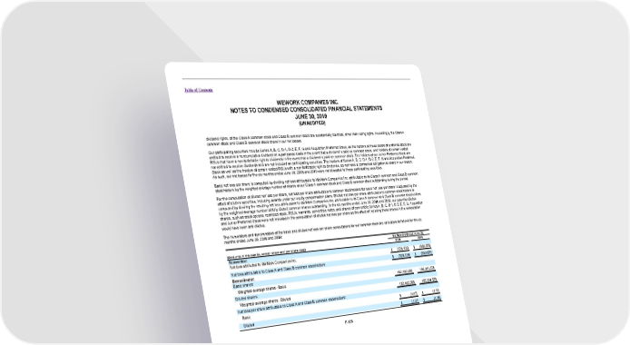 Table of Contents WEWORK COMPANIES INC. NOTES TO CONDENSED CONSOLIDATED FINANCIAL STATEMENTS JUNE 30, 2019 (UNAUDITED) dividend rights, of the Class A common stock and Class B common stock are substantially identical, other than voting rights. Accordingly, the Class A common stock and Class B common stock share in our net losses. Our participating securities include Series A, B, C, D-1, D-2, E, F, G and Acquisition Preferred Stock, as the holders of these series of preferred stock are entitled to receive a noncumulative dividend on a pari passu basis in the event that a dividend is paid on common stock, and holders of certain vested RSUs that have a non-forfeitable right to dividends in the event that a dividend is paid on common stock. The holders of our Junior Preferred Stock are not entitled to receive dividends and are not included as participating securities. The holders of Series A, B, C, D-1, D-2, E, F, G and Acquisition Preferred Stock as well as the holders of certain vested RSUs with a non-forfeitable right to dividends, do not have a contractual obligation to share in our losses. As such, our net losses for the six months ended June 30, 2018 and 2019 were not allocated to these participating securities. Basic net loss per share is computed by dividing net loss attributable to WeWork Companies Inc. attributable to its Class A common and Class B common stockholders by the weighted-average number of shares of our Class A common stock and Class B common stock outstanding during the period. For the computation of diluted net loss per share, net loss per share attributable to common stockholders for basic net loss per share is adjusted by the effect of dilutive securities, including awards under our equity compensation plans. Diluted net loss per share attributable to common stockholders is computed by dividing the resulting net loss attributable to WeWork Companies Inc. attributable to its Class A common and Class B common stockholders by the weighted-average number of fully diluted common shares outstanding. In the six months ended June 30, 2018 and 2019, our potential dilutive shares, such as stock options, restricted stock, RSUs, warrants, convertible notes, and shares of convertible Series A, B, C, D-1, D-2, E, F, G, Acquisition and Junior Preferred Stock were not included in the computation of diluted net loss per share as the effect of including these shares in the computation would have been anti-dilutive. The numerators and denominators of the basic and diluted net loss per share computations for our common stock are calculated as follows for the six months ended June 30, 2018 and 2019: Six Months Ended June 30, (Amounts in thousands, except share and per share data) 2018 2019 Numerator: Net loss attributed to WeWork Companies Inc. $ (628,130) $ (689,676) Net loss attributable to Class A and Class B common stockholders $ (628,130) $ (689,676) Denominator: Basic shares: Weighted-average shares - Basic 162,482,366 166,301,575 Diluted shares: Weighted-average shares - Diluted 162,482,366 166,301,575 Net loss per share attributable to Class A and Class B common stockholders: Basic $ (3.87) $ (4.15) Diluted $ (3.87) $ (4.15) F-126