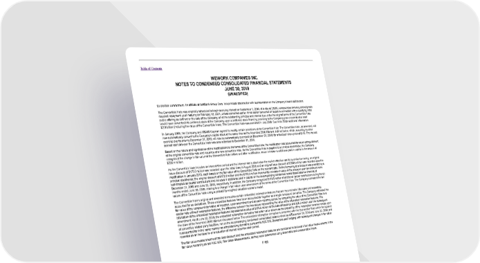 Table of Contents WEWORK COMPANIES INC. NOTES TO CONDENSED CONSOLIDATED FINANCIAL STATEMENTS JUNE 30, 2019 (UNAUDITED) $1.0 billion commitment. An affiliate of SoftBank Group Corp. is a principal stockholder with representation on the Company’s board of directors. The Convertible Note was originally scheduled to begin accruing interest on September 1, 2019, at a rate of 2.80%, compounded annually, and originally required repayment upon maturity on February 12, 2024, unless converted earlier. If not earlier converted or repaid in connection with a qualifying initial public offering as defined or the sale of the Company, all of the outstanding principal and interest due under the original terms of the Convertible Note would have converted into preferred stock of the Company upon a preferred stock financing providing to the Company gross proceeds of at least $2.0 billion (including the value of the Convertible Note). The Convertible Note was exercised in July 2019. See Note 25 for additional information. In January 2019, the Company and SBWW Cayman agreed to modify certain provisions of the Convertible Note. The Convertible Note, as amended, will now automatically convert to the Company’s capital stock at the same time as the Amended 2018 Warrant, defined below, which, assuming no other exercise events prior to December 31, 2019, will now be automatically exercised on December 31, 2019, for a fixed per share price of $110. The interest accrual start date per the Convertible Note was also extended to December 31, 2019. Based on the nature and significance of the modifications to the terms of the Convertible Note, the modification was accounted for as an extinguishment of the original convertible note and issuance of a new convertible note. As the Convertible Note is payable to a principal stockholder, the Company recognized the change in fair value of the Convertible Note before and after modification, as an increase to additional paid in capital in the amount of $236.4 million. As the Convertible Note includes an interest-free period and the interest rate is also below the market effective rate for a similar borrowing, an original issue discount of $170.0 million was recorded upon the initial draw in August 2018 and an original issue discount of $286.8 million was recorded upon the modification in January 2019, each based on the fair value of the Convertible Note on the relevant date. As the borrowing at a discount was provided by a principal stockholder, the original discount of $170.0 million and the $116.9 million incremental increase in value of the discount upon amendment were both treated as capital contributions and included in additional paid in capital on the accompanying condensed consolidated balance sheet as of December 31, 2018 and June 30, 2019, respectively. In addition, the Company recognized $119.5 million of additional capital contributions during the six months ended June 30, 2019, relating to a change in fair value upon amendment of the terms of the Convertible Note. The Company estimated the fair values of the Convertible Note using a probability-weighted valuation scenario model. The Convertible Note’s original and amended terms also contain embedded redemption features that are required to be bifurcated and separately accounted for as derivatives. These embedded features have been accounted for together as a single compound derivative. The Company estimated the fair value of the compound derivative at inception, upon amendment and at each reporting period, by comparing the value of the Convertible Note to a similar note without redemption features, the difference between the two values representing the value of the bifurcated redemption features. The bifurcation of the embedded redemption features represented a value of $178.8 million at the date of issuance and $25.3 million upon the subsequent amendment. As of June 30, 2019, the embedded redemption derivative had a fair value of zero as the probability of the redemption became remote upon the draw of the Amended 2018 Warrant discussed below. The embedded redemption derivative is presented with the Convertible Note within the balance of convertible related party liabilities, net on the accompanying condensed consolidated balance sheet as of December 31, 2018 and June 30, 2019, and is accounted for in the same manner as a freestanding derivative pursuant to ASC 815, Derivatives and Hedging, with subsequent changes in fair value recorded as an increase to or a reduction of interest expense each period. The fair value measurements of the debt discount and the embedded redemption features are considered to be Level 3 fair value measurements in the fair value hierarchy as per ASC 820, Fair Value Measurements, as they were determined using observable and unobservable inputs. F-105
