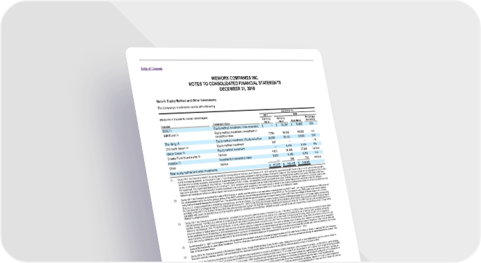 Table of Contents WEWORK COMPANIES INC. NOTES TO CONSOLIDATED FINANCIAL STATEMENTS DECEMBER 31, 2018 Note 9. Equity Method and Other Investments The Company’s investments consist of the following: December 31, (Amounts in thousands, except percentages) 2017 2018 Carrying Carrying Percentage Investee Investment Type Value Value Cost Basis Ownership (1) DSQ Equity method investment / Note receivable $ — $ 52,291 $ 53,067 10% (2) WPI Fund Equity method investment / Investment in convertible notes 7,759 66,592 65,568 4% (3) The Wing Equity method investment / Equity securities 38,000 59,163 52,000 23% (4) 210 North Green Equity method investment 697 — — —% (5) Waller Creek Equity method investment — 6,464 6,464 5% (6) Creator Fund Investments Various 4,833 28,008 27,880 Various (7) IndiaCo Investment in convertible notes 5,928 5,319 5,248 N/A Other Various — 598 738 Various Total equity method and other investments $ 57,217 $ 218,435 $ 210,965 (1) During 2017, the Company entered into an agreement for the acquisition of DSQ and as of December 31, 2017 had funded approximately $77.8 million for a non-refundable deposit relating to this purchase agreement, as discussed in Note 3. The Company subsequently assigned its right to purchase DSQ to DSQ Partners. DSQ Partners closed on the acquisition of DSQ in April 2018 and the Company received a reimbursement of approximately $25.0 million, which represented the difference between the deposit funded and the Company’s 10% share of the total capital contribution requirements of DSQ Partners. The net balance of $53.1 million, represents the Company’s investment in DSQ Partners including capitalized legal costs associated with the investment. The investment balance as of December 31, 2018, includes a note receivable with an outstanding balance of $25.1 million that accrues interest at a rate of 6.08% and matures in April 2028. The remaining $27.2 million investment is an equity method investment. The Company was a tenant in one of the properties within DSQ prior to the acquisition by DSQ Partners and subsequent to the acquisition signed new leases for additional space in other locations within DSQ. See Note 24 for additional details. (2) During 2017, the Company subscribed for a total of $27.0 million in capital commitments to a new real estate investment fund (the “WPI Fund”), including its commitments as a 50% owner of the unconsolidated entity that is the general partner of the WPI Fund and its commitments as a limited partner of the WPI Fund. The Company is also a 50% owner in the unconsolidated entity that is the asset manager for the WPI Fund. The other 50% owner of both the general partner and the asset manager of the WPI Fund, is an affiliate of Rhône Group L.L.C. Rhône Group L.L.C. is also a shareholder of WeWork Companies Inc. and Rhône Group L.L.C.’s controlling member is also a director of WeWork Companies Inc. Of the total capital commitments, the Company had funded approximately $15.5 million as of December 31, 2018. During 2018, the Company also funded an additional $50.0 million for a convertible note to a wholly-owned subsidiary of the WPI Fund. During February 2019, this note converted into equity in the 424 Fifth Venture as defined and discussed in Note 26. The WPI Fund expects to invest primarily in real estate with current or expected vacancy that would be suitable for, and that would benefit from, WeWork occupancy as well as potential investments in properties at which or near where WeWork is already a tenant. (3) During 2017, the Company acquired a 25% interest, comprised of common and preferred shares, in Refresh Club, Inc. (“The Wing”) for $38.0 million, which was accounted for as an equity method investment. The Wing is a network of co-working and community spaces for women and its mission is to create space for women to advance their pursuits and build community together. During 2018, the Company acquired an additional $14.0 million of preferred shares in connection with a new round of financing by The Wing, which resulted in the Company’s ownership decreasing to 23%. The preferred shares, including both the preferred shares acquired during 2017 and the preferred shares acquired during 2018, were determined to be equity securities without a readily determinable fair value and are measured using the measurement alternative. The common shares acquired during 2017 remained an equity method investment. As this additional round of financing in 2018 represented an orderly market transaction, the preferred shares acquired during 2017 were revalued based primarily on Level 3 inputs of the fair value hierarchy, including the enterprise value implied by the new round of financing and other inputs. The Company recorded an associated $8.0 million gain, which is reflected in the income (loss) from equity method and other investments on the accompanying consolidated statement of operations for the year ended December 31, 2018. (4) As of December 31, 2017, the Company held a 5% investment in the landlord entity at the Company’s leased location at 210 North Green in Chicago, Illinois. In January 2018, the Company received $2.2 million for the sale of this investment. The $1.5 million gain has been deferred as a result of the Company’s continuing involvement through its capital lease at this location. See Note 24 for additional details. (5) During 2018, the Company acquired a 5% interest in Waller Creek, through WeWork Waller Creek, for $6.5 million. Waller Creek is a joint venture established to acquire a parcel of land in Texas and develop, manage, operate, and eventually sell the developed property. Waller Creek closed on the $126.0 million acquisition of land in December 2018. (6) During 2018, the Company launched the Creator Fund that will make investments in recipients of WeWork’s Creator Awards and other investments through use of a venture capital strategy. The Creator Fund is a consolidated subs