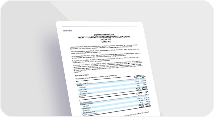 Table of Contents WEWORK COMPANIES INC. NOTES TO CONDENSED CONSOLIDATED FINANCIAL STATEMENTS JUNE 30, 2019 (UNAUDITED) notes include interest rates ranging from 1.7% to 2.6% and have maturities ranging from 2023 to 2028. As of December 31, 2018 and June 30, 2019, $5.7 million and $10.6 million, respectively, was recorded in other assets on the accompanying condensed consolidated balance sheets. During the six months ended June 30, 2019, the Company closed on the acquisition of the 424 Fifth Venture from an entity that shares a common board member with the Company. See Note 7 for additional details. During the six months ended June 30, 2018 and 2019, the Company recognized expenses of approximately $0.1 million and $0.8 million, respectively, for services provided by an entity that is a principal stockholder with representation on the Company’s board of directors. During the six months ended June 30, 2018 and 2019, the Company recognized expenses of $0.2 million and $0.1 million, respectively, for services provided by a vendor in which the Company has an equity method investment. During the six months ended June 30, 2018 and 2019, the Company recognized expenses totaling approximately $84,000 and $20,000, respectively, in connection with promotional services performed by an immediate family member of a principal stockholder, executive officer and director of the Company for the Creator Awards ceremonies. During the six months ended June 30, 2018 and 2019, the Company recognized expenses totaling $80,000 and $110,000, respectively, for an employee of the Company, who is an immediate family member of a principal stockholder, executive officer and director of the Company. Note 23. Concentration The Company’s revenues and total property and equipment, by country, are as follows: Six Months Ended June 30, (Amounts in thousands) 2018 2019 Revenue: United States $470,918 $ 853,473 United Kingdom 123,728 210,839 Greater China 29,476 93,558 Other foreign countries 139,649 377,550 Total revenue $763,771 $1,535,420 December 31, June 30, (Amounts in thousands) 2018 2019 Property and equipment: United States $ 2,997,154 $4,766,306 United Kingdom 537,568 689,443 Greater China 247,654 341,208 Other foreign countries 1,157,903 1,736,879 Total property and equipment $ 4,940,279 $7,533,836 Note 24. Net Loss Per Share We compute net loss per share of Class A common stock and Class B common stock under the two-class method required for multiple classes of common stock and participating securities. The rights, including the liquidation and F-125