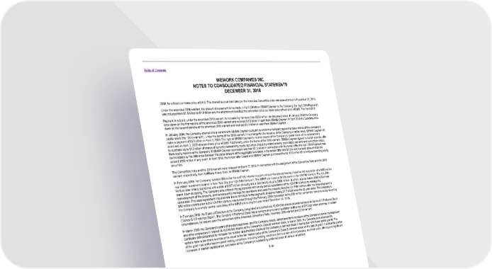 Table of Contents WEWORK COMPANIES INC. NOTES TO CONSOLIDATED FINANCIAL STATEMENTS DECEMBER 31, 2018 2019, for a fixed per share price of $110. The interest accrual start date per the Amended Convertible Note was also extended to December 31, 2019. Under the amended 2018 warrant, the amount of a payment to be made in April 2019 from SBWW Cayman to the Company (the “April 2019 Payment”) was reduced from $1.5 billion to $1.0 billion and the amendment modified the conversion price per share to be a fixed price of $110. The April 2019 Payment is subject, under the amended 2018 warrant, to increase by not more than $500 million, as discussed below. In January 2019 the Company drew down on the first tranche of the amended 2018 warrant and received $1.5 billion in cash from SBWW Cayman. In April 2019 the Company drew down on the second tranche of the amended 2018 warrant and received $1.0 billion in cash from SBWW Cayman. In January 2019, the Company entered into a warrant with SBWW Cayman pursuant to which the Company agreed to issue shares of the Company’s capital stock (the “2019 warrant”). Under the terms of the 2019 warrant, in exchange for the issuance of the Company’s capital stock, SBWW Cayman will make a payment of $1.5 billion on April 3, 2020. The right of SBWW Cayman to receive shares of the Company’s capital stock will be automatically exercised on April 3, 2020 at a per-share price of $110. Additionally, under the terms of the 2019 warrant, SBWW Cayman agreed to launch a tender offer to purchase up to $1.0 billion of shares of currently-outstanding equity securities (including vested options, exercisable warrants and convertible notes) from equity holders of the Company. If SBWW Cayman purchases less than $1.0 billion in connection with the tender offer, the April 2019 Payment may be increased by the difference between the dollar amount of the aggregate purchases in the tender offer and $1.0 billion, but such amount shall not exceed $500 million in any event. In April 2019, the tender offer closed and SBWW Cayman purchased the full $1.0 billion of currently-outstanding equity securities. The Convertible Note and the 2019 warrant were reissued on March 7, 2019, in connection with the assignment of the Convertible Note and the 2019 warrant, respectively, from SoftBank Group Corp. to SBWW Cayman. In February 2019, the Company invested $50 million for a 17.4% interest in a joint venture that simultaneously closed on the acquisition of a $850 million real estate investment located in New York City (the “424 Fifth Venture”). The WPI Fund is also a 39.1% owner in the 424 Fifth Venture. The 424 Fifth Venture was initially capitalized with a total of $287 million of equity and a debt facility of up to $900 million, of which, approximately $600 million was drawn down at closing. The Company also entered into agreements with wholly owned subsidiaries of the 424 Fifth Venture to manage the redevelopment of the property, and subsequently manage the operations and lease the property from the 424 Fifth Venture after the redevelopment is completed. The lease agreement includes total future minimum rental payments of approximately $1.7 billion over the 20 year lease. The Company’s $50 million contribution to the 424 Fifth Venture was funded through the February 2019 conversion of the $50 million convertible note previously issued by the Company to a wholly-owned subsidiary of the WPI Fund during the year ended December 31, 2018. In February 2019, the Board of Directors of the Company designated and authorized 45,454,548 shares of preferred stock as Series G-1 Preferred Stock (“Series G-1 Preferred Stock”). The Series G-1 Preferred Stock has a conversion price and liquidation preference of $110 per share and may, in certain circumstances, be issued upon the conversion of the Amended Convertible Note, Amended 2018 warrant and 2019 warrant. In March 2019, the Company’s board of directors approved, and the Company issued, option awards to members of the Company’s senior management and other employees in respect of 48,510,093 shares of the Company’s Class B common stock. In March 2019, the Company also amended its Certificate of Incorporation to increase the number of authorized shares of the Company’s common stock in connection with these option grants. The options have a per-share exercise price equal to the fair market value of the Company’s Class B common stock on the date of grant. A substantial portion of the grant has performance-based vesting conditions, including vesting conditions tied to a sale of the Company, an initial public offering and significant increases in market capitalization, and sales of the Company’s outstanding preferred stock at various valuations. F-64
