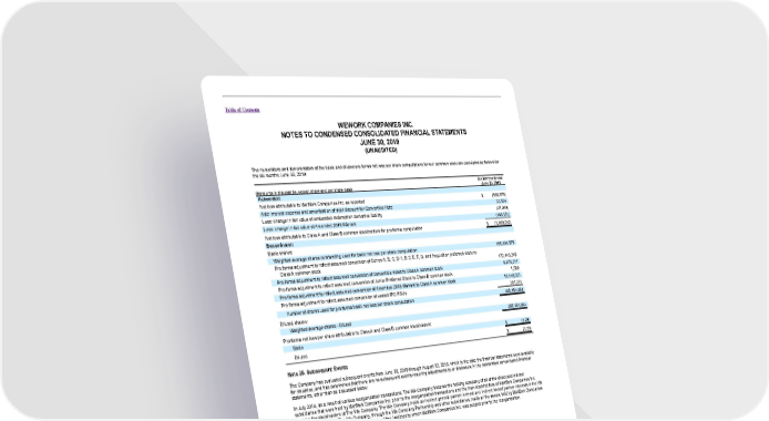 Table of Contents WEWORK COMPANIES INC. NOTES TO CONDENSED CONSOLIDATED FINANCIAL STATEMENTS JUNE 30, 2019 (UNAUDITED) The numerators and denominators of the basic and diluted pro forma net loss per share computations for our common stock are calculated as follows for the six months June 30, 2019: Six Months Ended (Amounts in thousands, except share and per share data) June 30, 2019 Numerator: Net loss attributable to WeWork Companies Inc. as reported $ (689,676) Add: interest expense and amortization of debt discount for Convertible Note 33,634 Less: change in fair value of embedded redemption derivative liability (27,049) Less: change in fair value of Amended 2018 Warrant (486,151) Net loss attributable to Class A and Class B common stockholders for pro forma computation $ (1,169,242) Denominator: Basic shares: Weighted-average shares outstanding used for basic net loss per share computation 166,301,575 Pro forma adjustment to reflect assumed conversion of Series A, B, C, D-1, D-2, E, F, G, and Acquisition preferred stock to Class A common stock 172,145,245 Pro forma adjustment to reflect assumed conversion of convertible notes to Class A common stock 9,876,211 Pro forma adjustment to reflect assumed conversion of Junior Preferred Stock to Class B common stock 1,500 Pro forma adjustment to reflect assumed conversion of Amended 2018 Warrant to Class A common stock 16,449,021 Pro forma adjustment to reflect assumed conversion of vested IPO RSUs 381,311 Number of shares used for pro forma basic net loss per share computation 365,154,863 Diluted shares: Weighted-average shares - Diluted 365,154,863 Pro forma net loss per share attributable to Class A and Class B common stockholders: Basic $ (3.20) Diluted $ (3.20) Note 25. Subsequent Events The Company has evaluated subsequent events from June 30, 2019 through August 12, 2019, which is the date the financial statements were available for issuance, and has determined that there are no subsequent events requiring adjustments to or disclosure in the condensed consolidated financial statements, other than as discussed below. In July 2019, as a result of various reorganization transactions, The We Company became the holding company of all of the direct and indirect subsidiaries that were held by WeWork Companies Inc. prior to the reorganization transactions and the then-stockholders of WeWork Companies Inc. became the stockholders of The We Company. The We Company holds an indirect general partner interest and indirect limited partner interests in the We Company Partnership. The We Company, through the We Company Partnership and other subsidiaries, holds all the assets held by WeWork Companies Inc. prior to the reorganization and is subject to all the liabilities to which WeWork Companies Inc. was subject prior to the reorganization. F-128