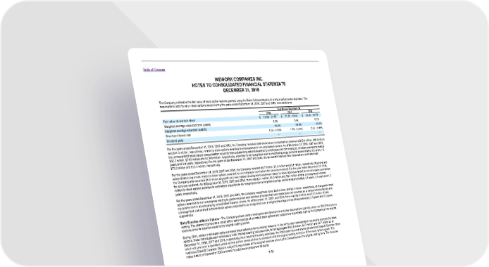 Table of Contents WEWORK COMPANIES INC. NOTES TO CONSOLIDATED FINANCIAL STATEMENTS DECEMBER 31, 2018 The Company estimates the fair value of stock option awards granted using the Black-Scholes Model and a single option award approach. The assumptions used to value stock options issued during the years ended December 31, 2016, 2017 and 2018, were as follows: Year Ended December 31, 2016 2017 2018 Fair value of common stock $ 18.98 - 21.57 $ 21.57 - 26.45 $ 26.45 - 26.75 Weighted average expected term (years) 6.28 6.42 6.19 Weighted average expected volatility 40.0% 40.0% 40.0% Risk-free interest rate 1.03 - 2.23% 1.78 - 2.32% 2.41 - 2.99% Dividend yield — — — For the years ended December 31, 2016, 2017 and 2018, the Company recorded total stock-based compensation expense of $12.0 million, $16.9 million and $44.3 million, respectively, related to stock options awarded to employees and non-employee directors. As of December 31, 2016, 2017 and 2018, the unrecognized stock-based compensation expense from outstanding options awarded to employees and non-employee directors was approximately $32.2 million, $71.5 million and $136.9 million, respectively, expected to be recognized over a weighted-average period of approximately 3.9 years, 4.2 years and 3.9 years, respectively. For the years ended December 31, 2017 and 2018, the tax benefit realized from stock options exercised was $70.0 million and $13.1 million, respectively. For the years ended December 31, 2016, 2017 and 2018, the Company recorded $0.7 million, $1.3 million and $1.1 million, respectively of general and administrative expenses related to stock options awarded to non-employee contractors for services rendered. For the year ended December 31, 2018, the Company also recorded $1.9 million of growth and new market development expenses related to stock options awarded to non-employee contractors for services rendered. As of December 31, 2016, 2017 and 2018, there was $3.4 million, $4.5 million and $8.1 million of total unrecognized expense related to stock options awarded to contractors expected to be recognized over a weighted-average period of approximately 3.4 years, 3.4 years and 4.2 years, respectively. For the years ended December 31, 2016, 2017 and 2018, the Company recognized none, $0.9 million, and $1.1 million, respectively, of charges for stock options awarded to non-employees relating to goods received and services provided that was capitalized and recorded as a component of property and equipment on the accompanying consolidated balance sheets. As of December 31, 2017, and 2018, there was $1.0 million and $1.2 million of total unrecognized cost related to these stock options expected to be recognized over a weighted-average period of approximately 3.3 years and 2.3 years, respectively. Early Exercise of Stock Options—The Company allows certain employees and directors to exercise stock options granted under the 2013 Plan prior to vesting. The shares received as a result of the early exercise of unvested stock options are subject to a repurchase right by the Company at the original exercise price for a period equal to the original vesting period. During 2014, certain individuals early exercised stock options prior to vesting; however, in lieu of the cash consideration required to exercise the stock options, these individuals each provided a 1.9% interest bearing recourse note, for an aggregate of $2.5 million, $2.7 million and $2.7 million as of December 31, 2016, 2017 and 2018, respectively. As a result of the early exercises, the individuals received shares of restricted Class B Common Stock which will vest over a specified period of time (which period of time is consistent with the original vesting schedule of the stock options grant). The restricted Class B Common Stock is subject to repurchase at the original exercise price by the Company over the original vesting term. The recourse notes mature in November 2023 and are included as a component of equity. F-53