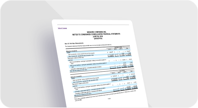 Table of Contents WEWORK COMPANIES INC. NOTES TO CONDENSED CONSOLIDATED FINANCIAL STATEMENTS JUNE 30, 2019 (UNAUDITED) Note 15. Fair Value Measurements The Company’s assets and liabilities measured at fair value on a recurring basis consisted of the following: December 31, 2018 (Amounts in thousands) Level 1 Level 2 Level 3 Total Assets: Cash equivalents—money market funds and time deposits $ 1,388,877 $ — $ — $ 1,388,877 Other investments—available-for-sale convertible notes — — 5,319 5,319 Total assets measured at fair value $ 1,388,877 $ — $ 5,319 $ 1,394,196 Liabilities: Other current liabilities—contingent consideration relating to acquisitions payable in stock $ — $ — $ 129,811 $ 129,811 Other current liabilities—contingent consideration relating to acquisitions payable in cash — — 10,520 10,520 Convertible related party liabilities—embedded redemption derivative — — 276,371 276,371 Total liabilities measured at fair value $ — $ — $ 416,702 $ 416,702 June 30, 2019 (Amounts in thousands) Level 1 Level 2 Level 3 Total Assets: Cash equivalents—money market funds and time deposits $ 2,010,340 $ — $ — $ 2,010,340 Other investments—available-for-sale convertible notes — — 5,544 5,544 Total assets measured at fair value $ 2,010,340 $ — $ 5,544 $ 2,015,884 Liabilities: Other current liabilities—contingent consideration relating to acquisitions payable in stock $ — $ — $ 17,975 $ 17,975 Convertible related party liabilities—embedded redemption derivative — — — — Convertible related party liabilities—Amended 2018 Warrant — — 1,945,005 1,945,005 Total liabilities measured at fair value $ — $ — $ 1,962,980 $ 1,962,980 There were no transfers between Level 1 and Level 2 of the fair value hierarchy during the year ended December 31, 2018 or the six months ended June 30, 2019. F-110