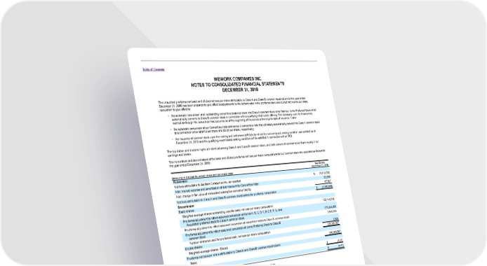 Table of Contents WEWORK COMPANIES INC. NOTES TO CONSOLIDATED FINANCIAL STATEMENTS DECEMBER 31, 2018 The unaudited pro forma net basic and diluted net loss per share attributable to Class A and Class B common stockholders for the year ended December 31, 2018 has been prepared to give effect to adjustments to the denominator in the pro forma basic and diluted net income per share calculation to give effect to: • the automatic conversion of all outstanding convertible preferred stock into Class A common stock other than our Junior Preferred Stock which automatically converts to Class B common stock in connection with a qualifying initial public offering. The Company used the if-converted method as though the conversion had occurred as of the beginning of the period or the original date of issuance, if later; • the automatic conversion of our Convertible Note and series C convertible note that ultimately automatically convert into Class A common stock at a conversion price of $110 per share and $5.36 per share, respectively; • the issuance of common stock upon the vesting and settlement of RSUs for which the service-based vesting condition was satisfied as of December 31, 2018 and the qualifying event-based vesting condition will be satisfied in connection with an IPO. The liquidation and dividend rights are identical among Class A and Class B common stock, and both classes of common stock share equally in our earnings and losses. The numerators and denominators of the basic and diluted pro forma net loss per share computations for our common stock are calculated as follows for the year ended December 31, 2018: Year Ended (Amounts in thousands, except share and per share data) December 31, 2018 Numerator: Net loss attributable to WeWork Companies Inc. as reported $ (1,610,792) Add: interest expense and amortization of debt discount for Convertible Note 22,359 Add: change in fair value of embedded redemption derivative liability 97,587 Net loss attributable to Class A and Class B common stockholders for pro forma computation $ (1,490,846) Denominator Basic shares: Weighted-average shares outstanding used for basic net loss per share computation 163,148,918 Pro forma adjustment to reflect assumed conversion of Series A, B, C, D-1, D-2, E, F, G, and Acquisition preferred stock to Class A common stock 171,369,355 Pro forma adjustment to reflect assumed conversion of convertible notes to Class A common stock 3,848,814 Pro forma adjustment to reflect assumed conversion of Junior Preferred Stock to Class B common stock 1,500 Number of shares used for pro forma basic net loss per share computation 338,368,587 Diluted shares: Weighted-average shares - Diluted 338,368,587 Pro forma net loss per share attributable to Class A and Class B common stockholders: Basic $ (4.41) Diluted $ (4.41) F-58