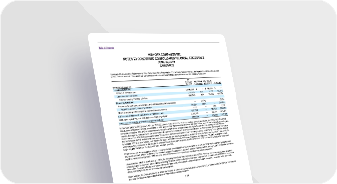 Table of Contents WEWORK COMPANIES INC. NOTES TO CONDENSED CONSOLIDATED FINANCIAL STATEMENTS JUNE 30, 2019 (UNAUDITED) Summary of Retrospective Adjustments to Prior Period Cash Flow Presentation—The following table summarizes the impact of the retrospective adoption of ASU 2016-18 and ASU 2016-15 on our condensed consolidated statement of cash flows for the six months ended June 30, 2018: As Previously ASU 2016-15 ASU 2016-18 (Amounts in thousands) Reported Adjustments Adjustments As Adjusted Investing Activities: Change in restricted cash $ (102,990) $ — $ 102,990 $ — Cash used for acquisitions (132,096) 2,804 1,275 (128,017) Net cash used by investing activities (995,242) 2,804 104,265 (888,173) Financing Activities: Payments for contingent consideration and holdback of acquisition proceeds — (2,804) — (2,804) Net cash provided by financing activities 748,598 (2,804) — 745,794 Effects of exchange rate changes on cash and cash equivalents 3,211 — (485) 2,726 Net increase in cash, cash equivalents, and restricted cash (327,796) — 103,780 (224,016) Cash, cash equivalents, and restricted cash—beginning of year 2,020,805 — 150,314 2,171,119 Cash, cash equivalents, and restricted cash—end of year 1,693,009 — 254,094 1,947,103 In February 2016, the FASB issued ASU No. 2016-02, Leases (“ASU 2016-02”), which was codified primarily as ASC No. 842 (“ASC 842”). The FASB also subsequently issued several amendments to ASC 842 including implementation guidance and various other amendments relating to accounting and presentation matters. ASC 842 requires lessees to recognize a right-of-use asset and lease liability for leases with initial terms greater than twelve months. Recognition, measurement and presentation of expenses for lessees will depend on classification as a finance lease (formerly referred to as a capital lease under ASC 840) or operating lease. The guidance for lessors remains relatively unchanged, except for a change in the definition of direct and incremental internal and external lease acquisition costs that are able to be capitalized as defined under the new guidance, which is also applicable to lessees. ASC 842, as amended, was effective for public business entities for fiscal years beginning after December 15, 2018, and interim periods within those fiscal years and is effective for all other entities for fiscal years beginning after December 15, 2019, and interim periods within fiscal years beginning after December 15, 2020, with early adoption permitted. In connection with the preparation of these interim condensed consolidated financial statements as of June 30, 2019, the Company early adopted ASC 842 and the related amendments using the modified retrospective approach, as if such adoption had occurred on January 1, 2019. In accordance with the modified retrospective approach, 2018 and prior amounts have not been adjusted and therefore may not be comparable. Upon adoption, effective as of January 1, 2019, the Company recorded a lease right-of-use asset (“ROU Asset”) and a corresponding lease obligation, primarily related to operating leases, of approximately $14 billion on its condensed consolidated balance sheet. The lease obligation reflects the present value of the Company’s future lease payments over the lease term, which includes renewal options that are reasonably assured of being exercised, discounted using a collateralized incremental borrowing rate. Upon adoption, the Company elected to utilize the package of practical expedients available under ASC 842, which permit the Company to not reassess the lease identification, lease classification and initial direct costs associated with F-81