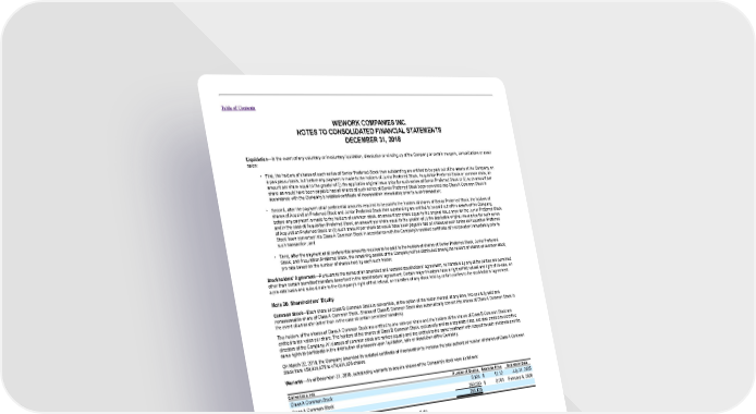Table of Contents WEWORK COMPANIES INC. NOTES TO CONSOLIDATED FINANCIAL STATEMENTS DECEMBER 31, 2018 Liquidation—In the event of any voluntary or involuntary liquidation, dissolution or winding up of the Company or certain mergers, consolidations or asset sales: • First, the holders of shares of each series of Senior Preferred Stock then outstanding are entitled to be paid out of the assets of the Company, on a pari passu basis, but before any payment is made to the holders of Junior Preferred Stock, Acquisition Preferred Stock or common stock, an amount per share equal to the greater of (i) the applicable original issue price for such series of Senior Preferred Stock or (ii) such amount per share as would have been payable had all shares of such series of Senior Preferred Stock been converted into Class A Common Stock in accordance with the Company’s restated certificate of incorporation immediately prior to such transaction; • Second, after the payment of all preferential amounts required to be paid to the holders of shares of Senior Preferred Stock, the holders of shares of Acquisition Preferred Stock and Junior Preferred Stock then outstanding are entitled to be paid out of the assets of the Company, before any payment is made to the holders of common stock, an amount per share equal to the original issue price for the Junior Preferred Stock and in the case of Acquisition Preferred Stock, an amount per share equal to the greater of (i) the applicable original issue price for such series of Acquisition Preferred Stock or (ii) such amount per share as would have been payable had all shares of such series of Acquisition Preferred Stock been converted into Class A Common Stock in accordance with the Company’s restated certificate of incorporation immediately prior to such transaction; and • Third, after the payment of all preferential amounts required to be paid to the holders of shares of Senior Preferred Stock, Junior Preferred Stock, and Acquisition Preferred Stock, the remaining assets of the Company will be distributed among the holders of shares of common stock, pro rata based on the number of shares held by each such holder. Stockholders’ Agreement—Pursuant to the terms of an amended and restated stockholders’ agreement, no transfers by any of the parties are permitted other than certain permitted transfers described in the stockholders’ agreement. Certain major investors have a right of first refusal and right of co-sale, on a pro rata basis and subordinate to the Company’s right of first refusal, on transfers of any stock held by certain parties to the stockholders’ agreement. Note 20. Shareholders’ Equity Common Stock—Each share of Class B Common Stock is convertible, at the option of the holder thereof, at any time, into one fully paid and nonassessable share of Class A Common Stock. Shares of Class B Common Stock also automatically convert into shares of Class A Common Stock in the event of a transfer (other than in the case of certain permitted transfers). The holders of the shares of Class A Common Stock are entitled to one vote per share and the holders of the shares of Class B Common Stock are entitled to ten votes per share. The holders of the shares of Class B Common Stock, exclusively and as a separate class, are also entitled to elect five directors of the Company. All classes of common stock are ranked equally and are entitled to the same treatment with respect to cash dividends and the same rights to participate in the distribution of proceeds upon liquidation, sale or dissolution of the Company. On March 22, 2018, the Company amended its restated certificate of incorporation to increase the total authorized number of shares of Class A Common Stock from 459,934,875 to 479,934,875 shares. Warrants—As of December 31, 2018, outstanding warrants to acquire shares of the Company’s stock were as follows: Convertible Into Number of Shares Exercise Price Expiration Date Class A Common Stock 6,128 $ 13.12 July 31, 2025 Class A Common Stock 250,000 $ 0.001 February 8, 2026 256,128 F-50