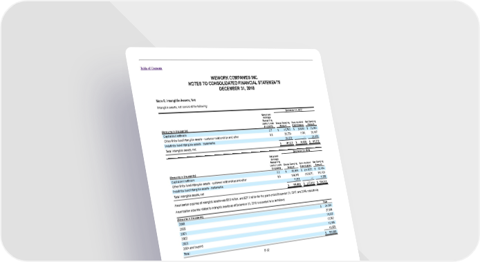 Table of Contents WEWORK COMPANIES INC. NOTES TO CONSOLIDATED FINANCIAL STATEMENTS DECEMBER 31, 2018 Note 8. Intangible Assets, Net Intangible assets, net consist of the following: December 31, 2017 Weighted- Average Remaining Useful Lives Gross Carrying Accumulated Net Carrying (Amounts in thousands) (in years) Amount Amortization Amount Capitalized software 2.7 $ 41,782 $ (9,800) $ 31,982 Other finite-lived intangible assets - customer relationships and other 9.8 26,273 (106) 26,167 Indefinite-lived intangible assets - trademarks 26,370 — 26,370 Total intangible assets, net $ 94,425 $ (9,906) $ 84,519 December 31, 2018 Weighted- Average Remaining Useful Lives Gross Carrying Accumulated Net Carrying (Amounts in thousands) (in years) Amount Amortization Amount Capitalized software 2.2 $ 56,986 $ (24,522) $ 32,464 Other finite-lived intangible assets - customer relationships and other 8.5 131,945 (12,521) 119,424 Indefinite-lived intangible assets - trademarks 7,255 — 7,255 Total intangible assets, net $ 196,186 $ (37,043) $ 159,143 Amortization expense of intangible assets was $5.6 million, and $27.1 million for the years ended December 31, 2017, and 2018, respectively. Amortization expense related to intangible assets as of December 31, 2018 is expected to be as follows: (Amounts in thousands) Total 2019 $ 34,391 2020 27,508 2021 16,022 2022 12,562 2023 12,485 2024 and beyond 48,920 Total $ 151,888 F-32