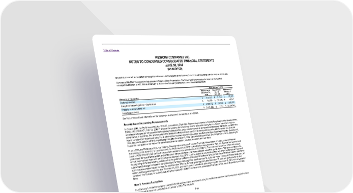 Table of Contents WEWORK COMPANIES INC. NOTES TO CONDENSED CONSOLIDATED FINANCIAL STATEMENTS JUNE 30, 2019 (UNAUDITED) any period presented as the pattern of recognition of revenue for the majority of the Company’s contracts did not change with the adoption of ASC 606. Summary of Modified Retrospective Adjustments to Balance Sheet Presentation—The following table summarizes the impact of the modified retrospective adoption of ASC 606 as of January 1, 2019 on the Company’s condensed consolidated balance sheet: As of January 1, 2019 Balance as of Adjustments Balance as of December 31, due to January 1, (Amounts in thousands) 2018 ASC 606 2019 Deferred revenue $ 113,237 $ (1,413) $ 111,824 Long-term lease obligations—Capital lease $ 50,785 $ (10,138) $ 40,647 Property and equipment, net $ 4,368,772 $ (9,850) $ 4,358,922 Accumulated deficit $ (3,311,285) $ 1,701 $ (3,309,584) See Note 3 for additional information on the Company’s revenues and the application of ASC 606. Recently Issued Accounting Pronouncements In October 2018, the FASB issued ASU No. 2018-17, Consolidation (Topic 810): Targeted Improvements to Related Party Guidance for Variable Interest Entities (“ASU 2018-17”). ASU No. 2018-17 amends the guidance for determining whether a decision-making fee is a variable interest and requires organizations to consider indirect interests held through related parties under common control on a proportional basis rather than as the equivalent of a direct interest in its entirety. The amendments in this update are effective for public entities for fiscal years beginning after December 15, 2019, and interim periods within those fiscal years. For all other entities the amendments in this update are effective for fiscal years beginning after December 15, 2020, and interim periods within fiscal years beginning after December 15, 2021. Early adoption is permitted. The Company is currently evaluating the impact the new guidance will have on its consolidated financial position, results of operations and cash flows. In June 2016, the FASB issued ASU No. 2016-13, Financial Instruments-Credit Losses (Topic 326): Measurement of Credit Losses on Financial Instruments (“ASU 2016-13”). In November 2018, the FASB issued ASU 2018-19, Codification Improvements to Topic 326, Financial Instruments-Credit Losses (“ASU 2018-19”) that clarifies the scope of the standard in the amendments in ASU 2016-13. The guidance changes how entities will measure credit losses for most financial assets and certain other instruments that are not measured at fair value through net income. The guidance replaces the current ‘incurred loss’ model with an ‘expected loss’ approach. ASU 2016-13 will be applied as a cumulative-effect adjustment to retained earnings as of the beginning of the first reporting period in which the guidance is effective. ASU 2016-13 is effective for public business entities that meet the definition of a Securities Exchange Commission filer (“SEC Filer”) for fiscal years beginning after December 15, 2019, and interim periods within those fiscal years, for public business entities that do not meet the definition of an SEC filer, for fiscal years beginning after December 15, 2020 and is effective for all other entities for fiscal years beginning after December 15, 2021, and interim periods within fiscal years beginning after December 15, 2021, with early adoption permitted. The Company is currently evaluating the impact ASU 2016-13 will have on its consolidated financial position, results of operations, and cash flows. Note 3. Revenue Recognition As of January 1, 2019, the Company adopted ASC 606 and the related amendments using the modified retrospective transition approach applied to those contracts which were not completed as of January 1, 2019. The results for F-84