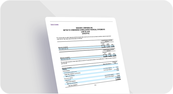 Table of Contents WEWORK COMPANIES INC. NOTES TO CONDENSED CONSOLIDATED FINANCIAL STATEMENTS JUNE 30, 2019 (UNAUDITED) The Company also had certain leases accounted for as capital leases under ASC 840 which are now referred to as finance leases and accounted for under ASC 842. Total lease costs for these leases are as follows: Six Months Ended June 30, 2018 Reported in: Depreciation and Interest (Amounts in thousands) Amortization Expense Total Total capital lease cost $ 1,081 $ 1,907 $ 2,988 Six Months Ended June 30, 2019 Reported in: Depreciation and Interest (Amounts in thousands) Amortization Expense Total Total finance lease cost $ 1,914 $ 2,261 $ 4,175 The below table presents the lease related liabilities recorded on the accompanying balance sheet as of December 31, 2018, as recorded in accordance with ASC 840: December 31, (Amounts in thousands) Balance Sheet Captions 2018 Liabilities Current liabilities Current portion of deferred rent Current lease obligations $ 71,034 Capital lease obligations, current portion Current lease obligations 1,958 Total current liabilities 72,992 Non-current liabilities Deferred rent Long-term lease obligations 2,831,747 Capital lease obligations Long-term lease obligations 50,785 Total non-current liabilities 2,882,532 Total lease obligations $ 2,955,524 F-92