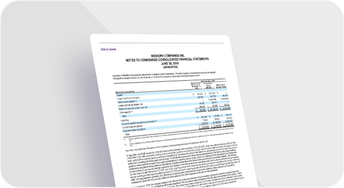 Table of Contents WEWORK COMPANIES INC. NOTES TO CONDENSED CONSOLIDATED FINANCIAL STATEMENTS JUNE 30, 2019 (UNAUDITED) Summary of Modified Retrospective Adjustments to Balance Sheet Presentation—The following table summarizes the impact of the modified retrospective adoption of ASC 842 as of January 1, 2019 on the Company’s condensed consolidated balance sheet: As of January 1, 2019 Balance as of Adjustments December 31, due to Balance as of (Amounts in thousands) 2018 ASC 842 January 1, 2019 Assets Lease incentives receivable $ 232,243 $ (232,243) $ — (1) Other current assets 385,601 (92,725) 292,876 Lease right-of-use assets, net — 11,628,660 11,628,660 Deferred lease acquisition cost, net 69,387 (69,387) — (1) Other assets 264,351 (39,229) 225,122 Total $ 951,582 $ 11,195,076 $ 12,146,658 Liabilities (2) Accounts payable and accrued expenses $ 826,396 $ (45,250) $ 781,146 Current lease obligations 72,992 130,531 203,523 Long-term lease obligations 2,882,532 11,109,795 13,992,327 Total $ 3,781,920 $ 11,195,076 $ 14,976,996 (1) Amount represents prepaid lease costs including rent, common area maintenance and real estate taxes, which are included as a component of the right-of-use asset upon adoption of ASC 842. (2) Amount represents accrued lease costs including rent, common area maintenance and real estate taxes, which are included as a reduction of the right-of-use asset upon adoption of ASC 842. See Note 4 for additional information on the Company’s leasing arrangements and the application of ASC 842. In May 2014, the FASB issued ASU 2014-09, Revenue from Contracts with Customers, (“ASU 2014-09”), which was codified primarily as ASC No. 606 (“ASC 606”). ASC 606 supersedes existing revenue recognition guidance and prescribes a single comprehensive model for entities to recognize revenue when control of the promised goods or services is transferred to customers at an amount that reflects the consideration to which the entity expects to be entitled to in exchange for those goods and services. The FASB also subsequently issued several amendments to ASC 606 including implementation guidance which clarified principal versus agent considerations in reporting revenue gross versus net, clarification of the identification and treatment for performance obligations and guidance on collectability, noncash consideration and various other accounting and presentation matters. ASC 606 also permits entities to use several practical expedients upon adoption. ASC 606, as amended, was effective for public business entities for annual reporting periods beginning after December 15, 2017, and interim reporting periods within those annual reporting periods and was effective for all other entities for annual reporting periods beginning after December 15, 2018, and interim reporting periods within annual reporting periods beginning after December 15, 2019, with early adoption permitted. ASC 606 should be applied either retrospectively to each prior reporting period presented or on a modified retrospective basis with the cumulative effect of initially applying ASC 606 recognized at the date of initial application. As of January 1, 2019, the Company adopted ASC 606 and the related amendments using the modified retrospective transition approach applied to contracts which were not completed as of the date of adoption. The cumulative impact of adopting ASC 606 was a net decrease to the January 1, 2019 opening balance of accumulated deficit of $1.7 million. The impact was primarily related to (i) $1.4 million of additional revenue reflected in prior periods from the sale of a software license that was previously deferred under ASC 605 and (ii) $0.3 million relating to the recognition of previously deferred gains associated with prior failed sale transactions. The adoption of the new standard did not have a material impact on the Company’s condensed consolidated financial position, results of operations or cash flows for F-83