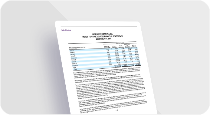 Table of Contents WEWORK COMPANIES INC. NOTES TO CONSOLIDATED FINANCIAL STATEMENTS DECEMBER 31, 2018 December 31, 2018 Shares Issued (Amounts in thousands, except per Conversion Liquidation Shares and Carrying share amounts) Price per Share Preference Authorized Outstanding Amount Series A $0.46 $ 17,500 38,393 38,393 $ 17,350 Series B 1.85 41,039 22,165 22,165 40,995 Series C 5.36 152,227 29,189 28,404 154,699 Series D-1 16.65 198,800 11,939 11,939 198,541 Series D-2 16.65 156,200 9,381 9,380 155,996 Series E 32.89 433,934 13,194 13,194 433,507 Series F 50.19 690,612 14,942 13,759 675,913 Series G 57.90 2,017,338 34,742 33,114 1,729,997 Acquisition 72.65 102,272 13,900 1,408 90,398 Junior 866.67 1,300 2 2 1,300 Total $ 3,811,222 187,847 171,758 $ 3,498,696 On various dates during the year ended December 31, 2016, the Company issued and sold an aggregate of 13,759,327 shares of its Series F Preferred Stock and approximately 250,000 warrants for the purchase of shares of Class A Common Stock at $0.001 for total net proceeds of $679.9 million (the “Series F Financing”). Approximately $675.9 million of the net proceeds were allocated to the Series F Preferred Stock and the remaining $4.0 million were allocated to the issuance of the warrants, recorded through additional paid-in capital. During the year ended December 31, 2017, the Company issued and sold an aggregate of 32,812,199 shares of its Series G Preferred Stock for net proceeds of $1,697.8 million (“Series G Financing”) and issued a total of 251,968 shares of Series G Preferred Stock in connection with acquisitions. The Series G Financing closed in three tranches during the year ended December 31, 2017. Per the terms of the agreement, if the second closing did not occur on or before June 30, 2017, the investor was required to purchase the shares at a price above fair market value. This legally binding commitment represented a forward option to sell 11.5 million shares of Series G Preferred Stock at a purchase price above its fair market value (“Tranche Right”) as of June 30, 2017. The Tranche Right was able to be legally separated and transferred to a party separate from the holder of the initial Series G Preferred Stock and was considered legally detachable from the Series G Preferred Stock. As such, the instrument was separately exercisable, as the execution of the June 2017 closing did not extinguish or otherwise impact the initial Series G Preferred Stock issued. Both criteria made the Tranche Right a freestanding instrument. Although the Tranche Right was to issue preferred stock rather than an obligation to repurchase the stock, the underlying shares of Series G Preferred Stock are redeemable upon the occurrence of an event outside the Company’s control, and thus the Tranche Right represented an obligation to repurchase shares pursuant to liability accounting. The Company recorded the $94.6 million fair market value of the Tranche Right forward option as an other investment on its balance sheet as of June 30, 2017, with a corresponding increase to income from equity method and other investments during the three months ended June 30, 2017 on the accompanying statement of operations. During the three months ended September 30, 2017, the Tranche Right was redeemed and reduced the carrying value of the Series G Preferred Stock by $94.6 million. During the fourth quarter of 2017, the investor and the Company closed a third tranche of Series G Financing. The agreement allowed the investor to purchase an additional 15.5 million shares of Series G Preferred Stock at a purchase price below the fair market value per share. This was considered a non-arm’s-length transaction as the investor is a significant shareholder of the Company. The third tranche of Series G Financing closed on October 25, F-47