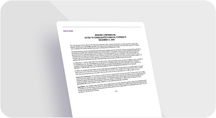 Table of Contents WEWORK COMPANIES INC. NOTES TO CONSOLIDATED FINANCIAL STATEMENTS DECEMBER 31, 2018 The credit agreement and the letter of credit reimbursement agreement contain customary representations, warranties, covenants (including certain financial covenants) and events of default applicable to the Company and its subsidiaries that could give rise to accelerated repayment. The Company was in compliance with all of the covenants required by the credit agreement as of December 31, 2018. Any amount borrowed under the credit agreement and reimbursement obligations under the letter of credit reimbursement agreement are guaranteed by the Company and certain of the Company’s domestic wholly-owned subsidiaries. The obligations under the revolving credit facility and letter of credit facility are secured on a pari passu basis (except with respect to certain cash collateral) by a lien on substantially all of the Company’s assets and substantially all of the assets of substantially all of the Company’s subsidiaries that are guarantors, as applicable, including the pledge of the equity interests in each of the Company’s, and the guarantors’, direct subsidiaries to secure the applicable loan, reimbursement and guarantee obligations. The guarantee and security requirements under each of these facilities are subject to certain customary exceptions and exclusions. As of December 31, 2017 and 2018, $481.7 million and $832.3 million, respectively, of stand-by letters of credit were outstanding under a combination of the credit facility and the letter of credit facility, the purpose of which is to guarantee payment under certain leases entered into by certain of the Company’s wholly owned subsidiaries. These letters of credit were secured by restricted cash of $130.3 million and $344.9 million, respectively, at December 31, 2017 and 2018. There were no borrowings outstanding under the credit agreement as of December 31, 2017 and 2018. In addition, the Company has also entered into various other letter of credit arrangements, the purpose of which is to guarantee payment under certain leases entered into by certain of the Company’s consolidated VIEs. There was $2.4 million, and $59.6 million of stand-by letters of credit outstanding under these other arrangements secured by $20.0 million and $74.8 million of restricted cash at December 31, 2017 and 2018, respectively. Construction Commitments—In the ordinary course of its business, the Company enters into certain agreements to purchase construction and related contracting services related to the build-outs of the Company’s operating locations that are enforceable and legally binding, and that specify all significant terms and the approximate timing of the purchase transaction. The Company’s purchase orders are based on current needs and are fulfilled by the vendors as needed in accordance with the Company’s construction schedule. As of December 31, 2017 and 2018, the Company had issued approximately $89.1 million, and $270.3 million, respectively, in such outstanding construction commitments. Legal Matters—The Company is, from time-to-time, party to litigation arising in the normal course of its business or litigation that is adequately covered by insurance. In the normal course of business, the Company also actively monitors violations of our valuable trademark rights and pursues legal action as determined appropriate. Management believes that none of these actions will have a material effect on the consolidated financial position, results of operations or cash flows of the Company. F-60