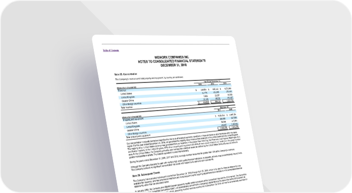 Table of Contents WEWORK COMPANIES INC. NOTES TO CONSOLIDATED FINANCIAL STATEMENTS DECEMBER 31, 2018 Note 25. Concentration The Company’s revenues and total property and equipment, by country, are as follows: Year Ended December 31, (Amounts in thousands) 2016 2017 2018 Revenue: United States $ 330,554 $ 607,332 $ 1,073,680 United Kingdom 81,176 153,095 275,615 Greater China 2,883 30,057 99,529 Other foreign countries 21,486 95,520 372,927 Total revenue $ 436,099 $ 886,004 $ 1,821,751 December 31, (Amounts in thousands) 2017 2018 Property and equipment: United States $ 1,854,543 $ 2,997,154 United Kingdom 299,388 537,568 Greater China 56,598 247,654 Other foreign countries 418,627 1,157,903 Total property and equipment $ 2,629,156 $ 4,940,279 Our concentration in specific territories magnifies the risk to us of localized economic conditions in those territories or other territories within the same region. For the year ended December 31, 2018, we generated the majority of our revenue from locations in the United States and the United Kingdom. The majority of our United States revenue was generated from our locations in the greater New York City, San Francisco, Los Angeles, Washington, D.C. and Boston markets. In the United Kingdom, 97% of our property and equipment and 98% of revenues are related to our locations in the greater London area. In the United States, the Company generally uses metropolitan statistical areas (as defined by the United States Census Bureau) to define its greater metropolitan markets. The nearest equivalent is used internationally. During the years ended December 31, 2016, 2017 and 2018, no single member accounted for greater than 10% of the Company’s revenues. Although the Company deposits its cash with multiple high credit quality financial institutions, its deposits, at times, may exceed federally insured limits. The Company believes no significant concentration risk exists with respect to its cash and cash equivalents. Note 26. Subsequent Events The Company has evaluated subsequent events from December 31, 2018 through April 25, 2019, which is the date the financial statements were available for issuance, and has determined that there are no subsequent events requiring adjustments to or disclosure in the consolidated financial statements, other than as discussed below. In January 2019, the Company and SBWW Cayman agreed to modify certain provisions of the Convertible Note and the 2018 warrant. The Convertible Note, as amended (“Amended Convertible Note”), will automatically convert to the Company’s capital stock at the same time as the 2018 warrant, as amended (the “amended 2018 warrant”), which, assuming no other exercise events prior to December 31, 2019, will now be automatically exercised on December 31, F-63