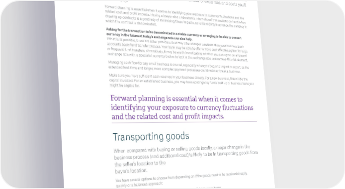 Currency costs Using a traditional bank transfer for foreign currency transactions can be expensive. The exchange rate your bank gives you might not be the best available due to currency fluctuation, and there are a number of extra fees and costs you’ll need to pay. Forward planning is essential when it comes to identifying your exposure to currency fluctuations and the related cost and profit impacts. Having a lawyer who understands international transactions on hand when drawing up contracts is a good way of minimising these impacts, as is identifying in advance the currency in which the contract is denominated. Asking for the transaction to be denominated in a stable currency or arranging to be able to convert currency in the future at today’s exchange rate can also help. If that isn’t possible, there are other providers that may offer cheaper solutions than your business bank account’s basic fund transfer process. Your bank may be able to offer a more cost-effective option for large or frequent fund transfers; alternatively, it may be worth investigating whether you can agree on a forward exchange rate with a specialist currency broker to lock in the exchange rate and remove this risk element. Managing cash flow for any small business is crucial, especially when you begin to import or export, as the extended lead time and longer, more complex payment processes could make or break a business. Make sure you have sufficient cash reserves in your business already. For a new business, this will be the capital invested. For an established business, you may have contingency funds built up or business loans you might be eligible for. Forward planning is essential when it comes to identifying your exposure to currency fluctuations and the related cost and profit impacts. Transporting goods When compared with buying or selling goods locally, a major change in the business process (and additional cost) is likely to be in transporting goods from the seller’s location to the buyer’s location. You have several options to choose from depending on if the goods need to be received cheaply, quickly or a balanced approach: • Air freight is typically used when transporting, small, high value items. • Sea freight is often used when moving consumer goods between Asia, Australasia or the US and the UK. This is popular as it’s a relatively cheap way to move large volumes of product around the world. • Rail transport is a cost-effective choice in nearer geographies as a lot of European rail services are frequent and fast. • Road transport by truck or container is highly flexible but is typically more expensive than rail or sea. You also need to consider tolls and potentially fuel price surcharges, which can be high. There are also some risks that longer journeys mean more chances that congestion or other disruption will cause an issue. The small business guide to import and export 6