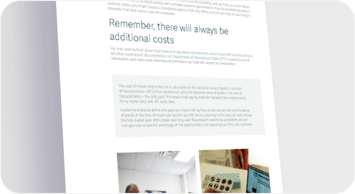 Working with a customs broker The role of a customs broker is to help set up the customs documents and licenses you may need for importing into the UK. They’ll make sure you have everything you need to clear customs smoothly, and can help you avoid delays and possible fines for failing to comply with complex customs requirements. If you’re considering using a customs broker, you might choose a standalone agency that only offers customs services, or use a freight forwarder that also covers customs processes. Remember, there will always be additional costs You may need to think about local taxes and regulatory requirements, which could add to costs, and you will often need export documentation. UK Department of International Trade (DIT) is a good source of information, and many local chambers of commerce can help with export documentation. The cost of import duty to the UK is calculated on the declared value of goods + the cost of transportation. VAT is then worked out using the declared value of goods + the cost of transportation + the duty paid. This means that paying more for transport also means you’re hit by higher duty and VAT costs later. Incoterms indirectly define who pays any import VAT as the normal rule so that only the owner of goods at the time of import can reclaim any VAT, hence planning in this area can help reduce the fully loaded cost. With proper planning, cash flow doesn’t need to be a problem; you can manage risks to take full advantage of the opportunities that exporting can offer your business. The small business guide to import and export 17
