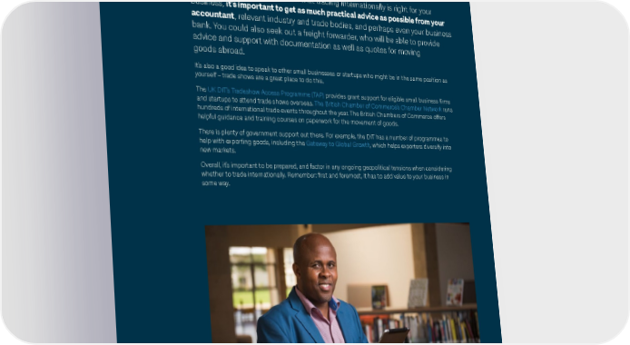Conclusion Once you’ve made the decision that trading internationally is right for your business, it’s important to get as much practical advice as possible from your accountant, relevant industry and trade bodies, and perhaps even your business bank. You could also seek out a freight forwarder, who will be able to provide advice and support with documentation as well as quotes for moving goods abroad. It’s also a good idea to speak to other small businesses or startups who might be in the same position as yourself – trade shows are a great place to do this. The UK DIT’s Tradeshow Access Programme (TAP) provides grant support for eligible small business firms and startups to attend trade shows overseas. The British Chamber of Commerce’s Chamber Network runs hundreds of international trade events throughout the year. The British Chambers of Commerce offers helpful guidance and training courses on paperwork for the movement of goods. There is plenty of government support out there. For example, the DIT has a number of programmes to help with exporting goods, including the Gateway to Global Growth, which helps exporters diversify into new markets. Overall, it’s important to be prepared, and factor in any ongoing geopolitical tensions when considering whether to trade internationally. Remember: first and foremost, it has to add value to your business in some way. The small business guide to import and export 19