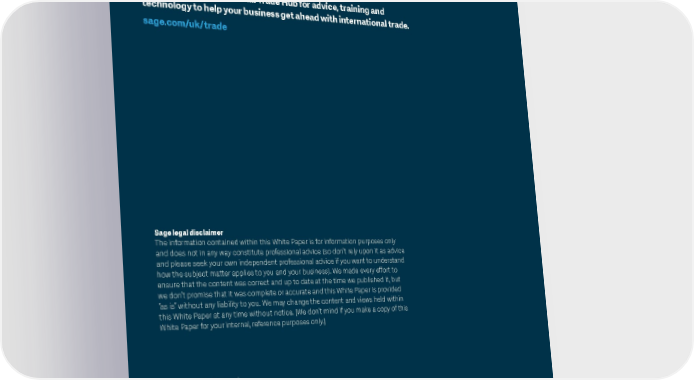 Visit the Sage International Trade Hub for advice, training and technology to help your business get ahead with international trade. sage.com/uk/trade Sage legal disclaimer The information contained within this White Paper is for information purposes only and does not in any way constitute professional advice (so don’t rely upon it as advice and please seek your own independent professional advice if you want to understand how the subject matter applies to you and your business). We made every effort to ensure that the content was correct and up to date at the time we published it, but we don’t promise that it was complete or accurate and this White Paper is provided “as is” without any liability to you. We may change the content and views held within this White Paper at any time without notice. [We don’t mind if you make a copy of this White Paper for your internal, reference purposes only.] 12pt DB Intro Copy Address Line 1 Sage (UK) Limited Address Line 2 North Park Address Line 3 Newcastle upon Tyne XXXX XXXX NE13 9AA www.xxxxxxx.xxx ©2017 The Sage Group plc or its licensors. Sage, Sage logos, Sage product and service names mentioned herein are the ©2019 The Sage Group plc or its licensors. Sage, Sage logos, Sage product and service names mentioned trademarks of The Sage Group plc or its licensors. All other herein are the trademarks of The Sage Group plc or its licensors. All other trademarks are the property of their trademarks are the property of their respective owners. NA/ respective owners. NA/WF 183498. WF 183498.