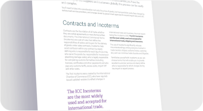 Understanding the complexities of importing and exporting Whilst trading internationally means that, as a small business, you have the opportunity to find suppliers and customers globally, the process can be costly and complex. You’ll need to take into consideration not only the price of goods, but transportation costs, fees charged by outsourced service providers, and charges levied by government agencies for export/import duty and VAT. Contracts and Incoterms Contracts are the foundation of all trade, whether international trade and business, the most recent they are verbal agreements or more formal written being the Incoterms 2020. The ICC Incoterms documents. The International Commercial Terms are the most widely used and accepted for (Incoterms) are a set of rules that define the international trade, shipping and insurance. responsibilities of sellers and buyers for the delivery The use of Incoterms significantly reduces of goods under sales contracts. Incoterms help misunderstandings among everyone involved in avoid confusion within any contract by clearly trade (vendor, shipper, customs broker, customer, defining who is responsible for each leg of a journey, etc.) and can minimise trade disputes and litigation. who owns the goods (i.e. responsible for insurance or absorbing damage costs), who is legally responsible Familiarise yourself with Incoterms so you can for completing customs formalities (including choose terms that will enable you to provide licenses, certificates and other paperwork) and who excellent customer service and clearly define pays any customs tariffs, excise costs, import VAT who is responsible for which charges during and other costs. the import or export process. The first Incoterms were created by the International Chamber of Commerce (ICC), who have regularly issued updated versions to reflect changes in The ICC Incoterms are the most widely used and accepted for international trade, shipping and insurance. The small business guide to import and export 4
